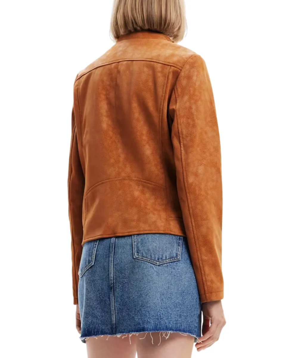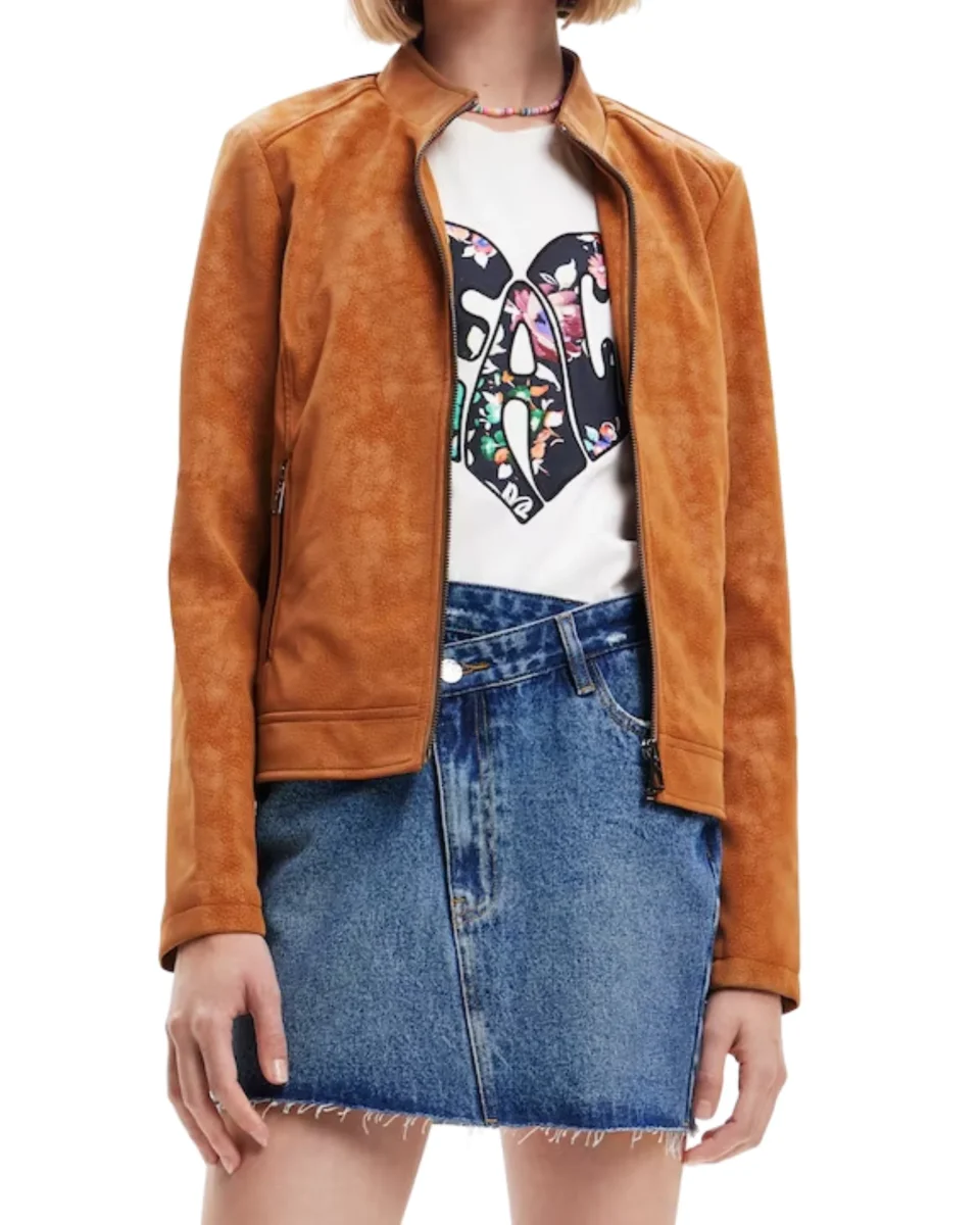 Giubbotto stile biker a maniche lunghe, collo mao e texture morbidissima, effetto scamosciato. Tasche con zip.