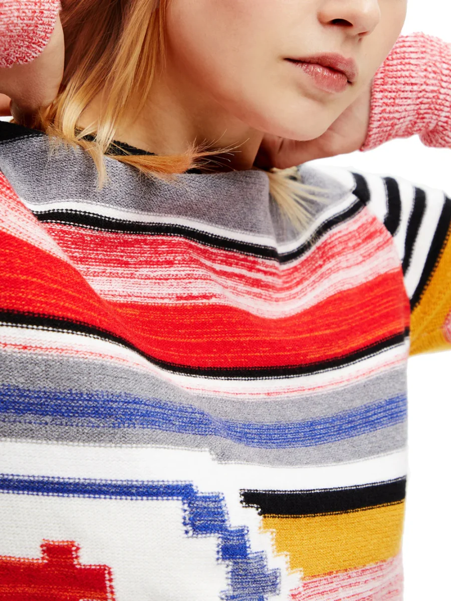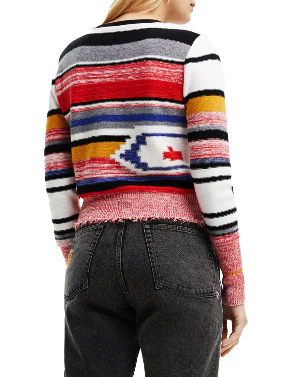 Questo maglione è stato realizzato con fibre ecologiche e ha un girocollo, maniche lunghe e una finitura sfrangiata sull’orlo. Ha un taglio regular fit e sfoggia una stampa etnica a righe.