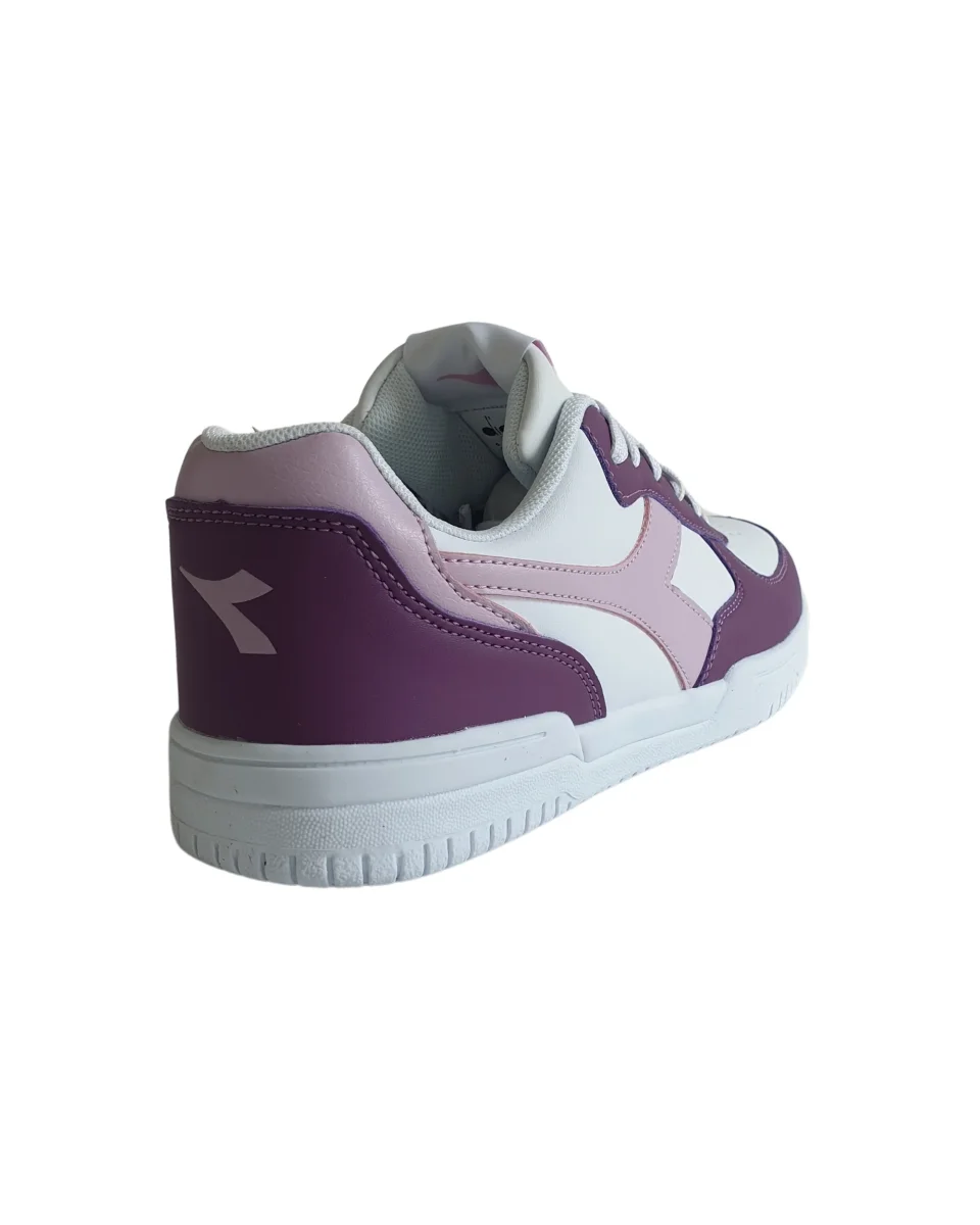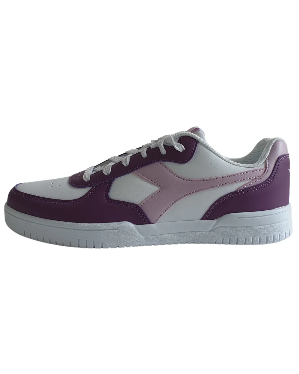 Scarpa Diadora modello Raptor Low realizzata in ecopelle sintetica, colorazione bianco-viola; calzatura stile sneaker casual con chiusura stringata, suola in TPE e dettagli in rilievo sulla tomaia.