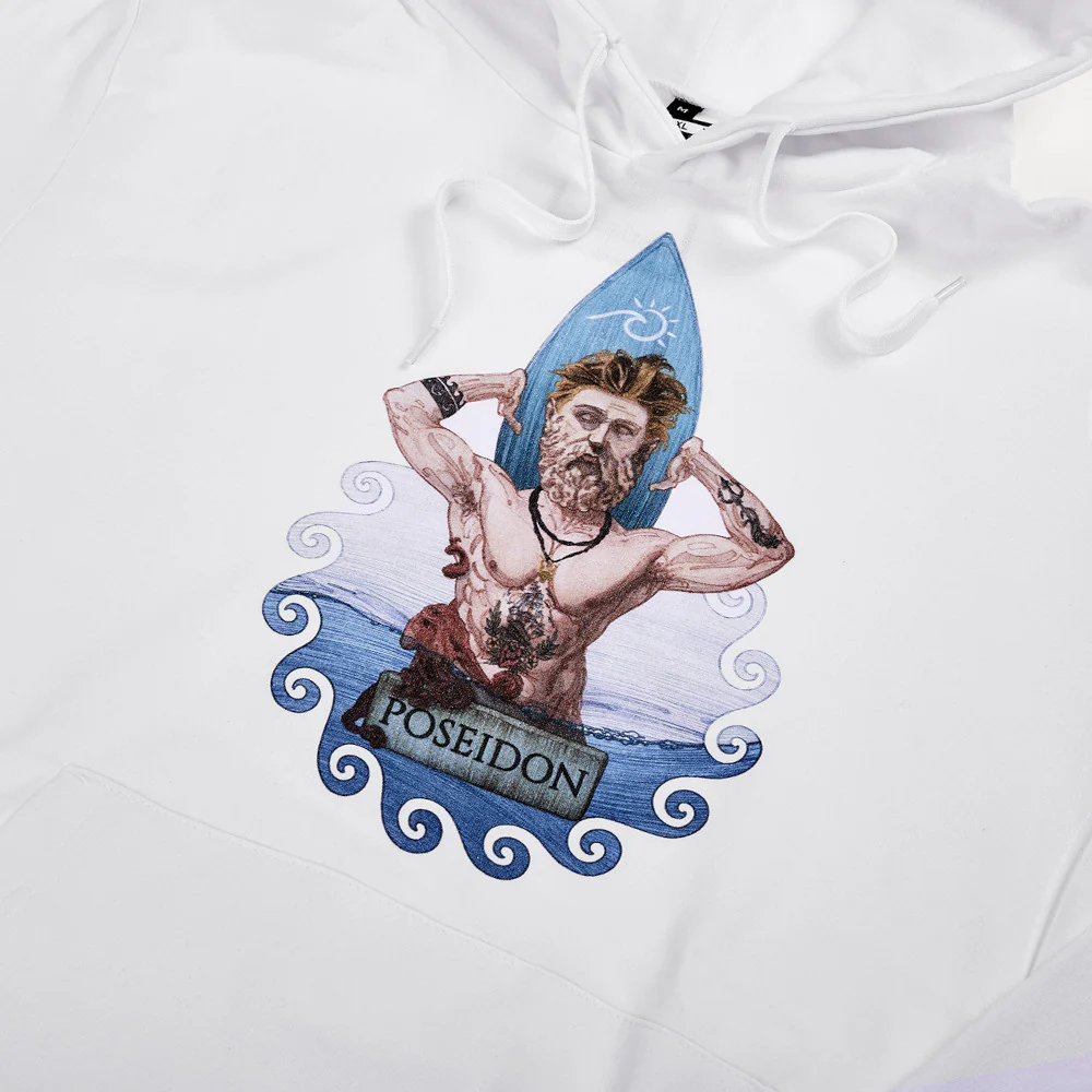 Poseidone, dio del mare, dei terremoti e dei cavalli, rappresenta la potenza e il mistero della natura. Noto per il suo tridente, simbolo della sua potenza, Poseidone ha ispirato storie di forza e dominio nel corso dei secoli. La felpa con cappuccio “Poseidone” trae ispirazione da questo dio leggendario, offrendo un design moderno che cattura la sua influenza senza tempo.