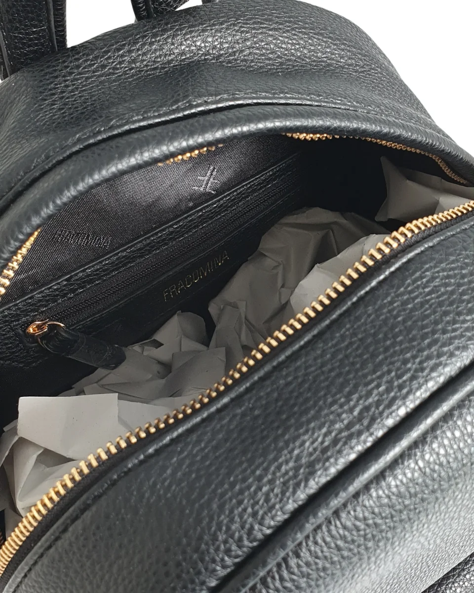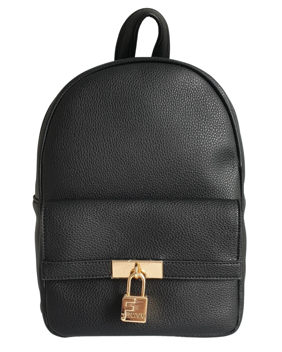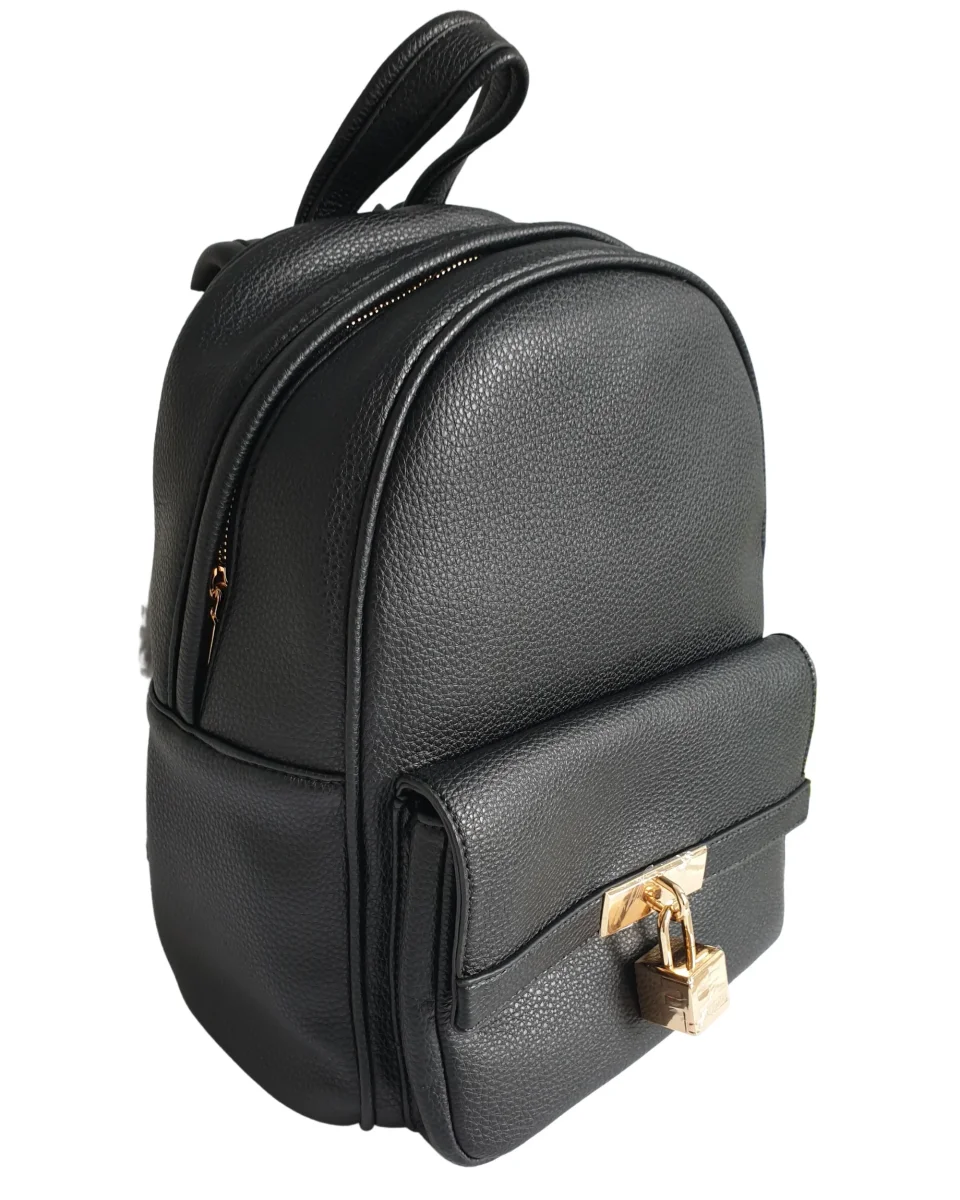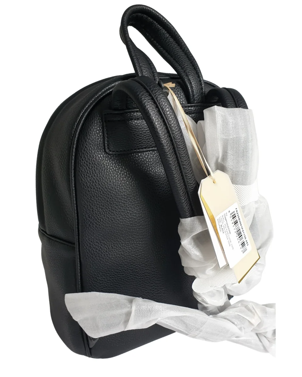 Borsa modello zainetto in ecopelle, con dettagli metallici, apertura all around con zip e tasca frontale con flap.
