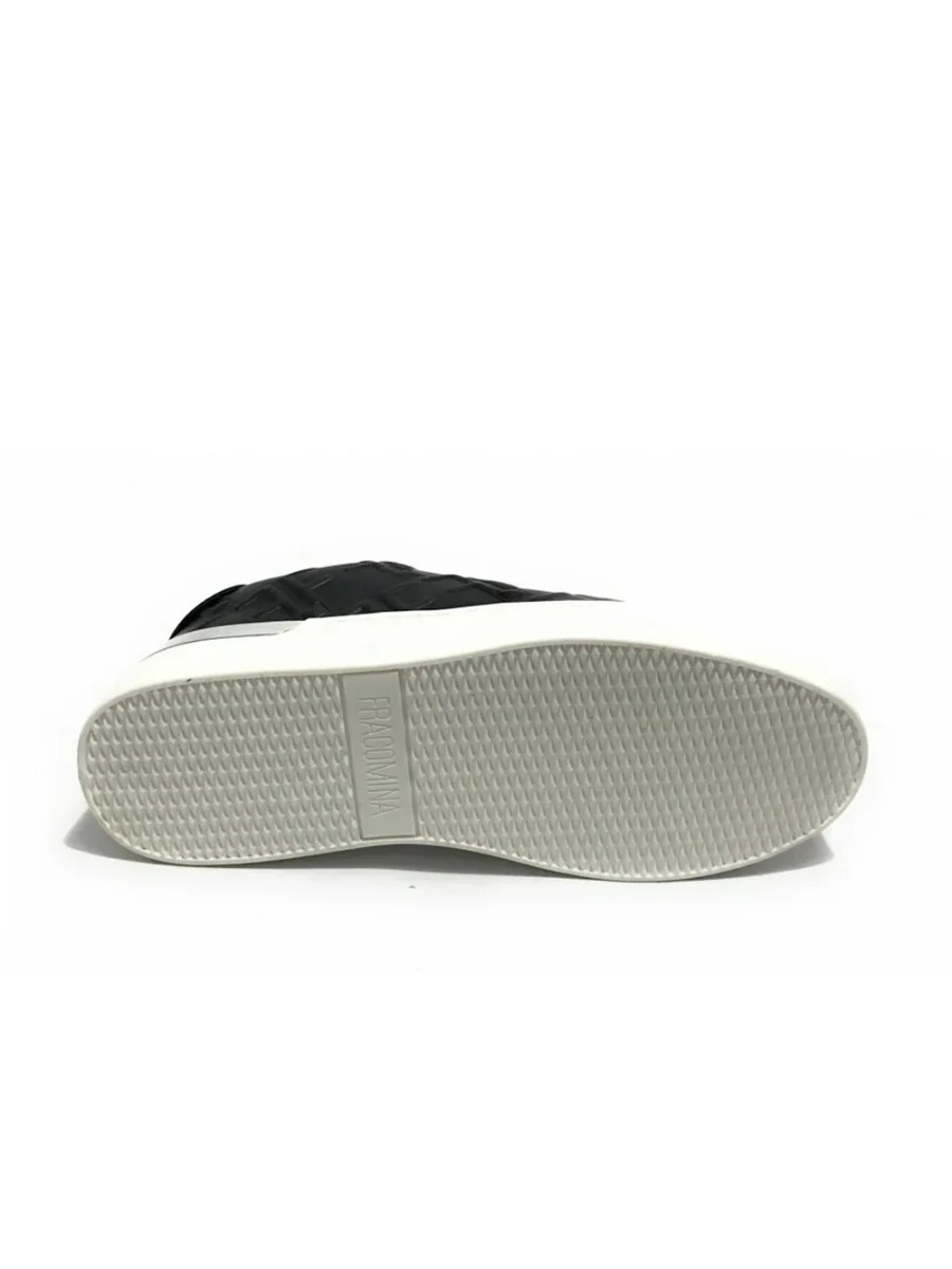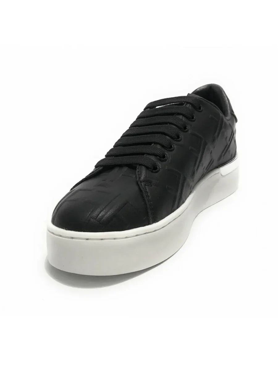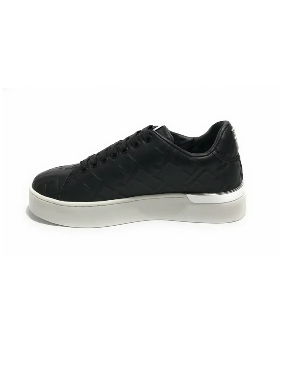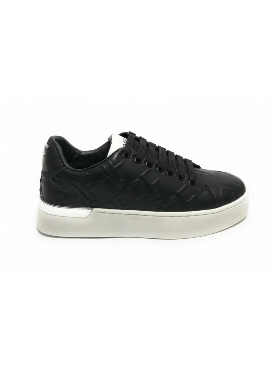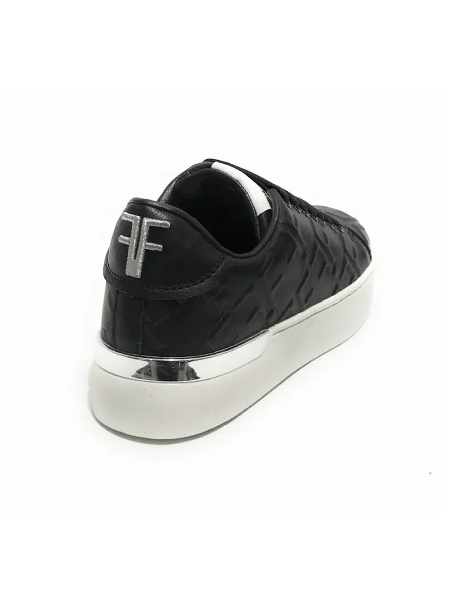 Scarpe donna sneaker bassa Fracomina. Realizzata in ecopelle di colore nero embossed, con logo in appliaczione su tallone. Chiusura con lacci di colore nero. Fondo in gomma di colore bianco, con inserto in abs color argento. Interno foderato in ecopelle, con fusbet rivestito in ecopelle estraibile. Tacco: 3,0 cm. Calzata giusta. Prodotto originale.