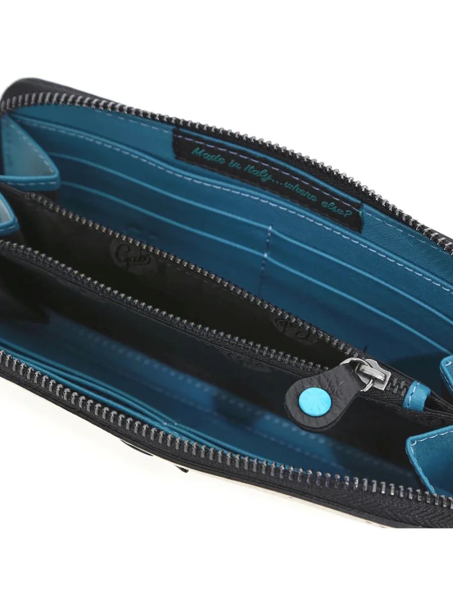GMONEY17: il portafogli Gabs per eccellenza! In vitello con chiusura a zip, scompartimenti interni con tasche per banconote e slots per carte e tasca per monete. La linea Black ripercorre i modelli della linea Basic ma è caratterizzata dal bottone nero, con cuciture e tinta del taglio vivo nero. Linea Soft Black, in pelle morbida e avvolgente.