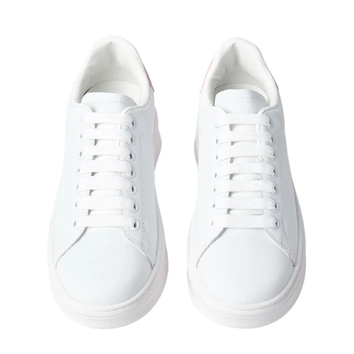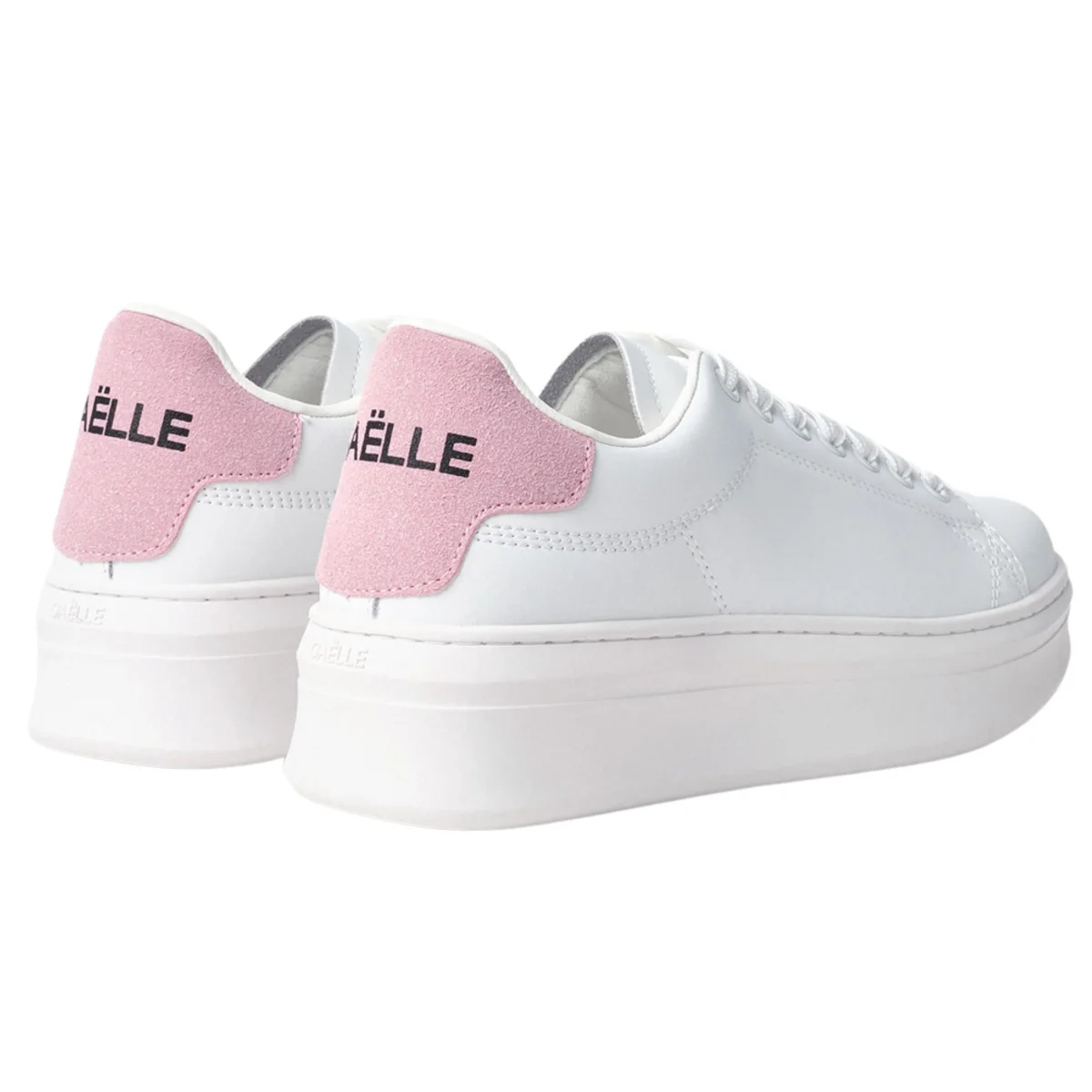 GAELLE PARIS – Sneakers in pelle bianca con inserto posteriore in pelle laminata oro e borchia rimovibile con strass. Logo lettering sulla linguetta. Fondo in gomma bold.