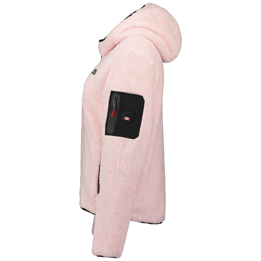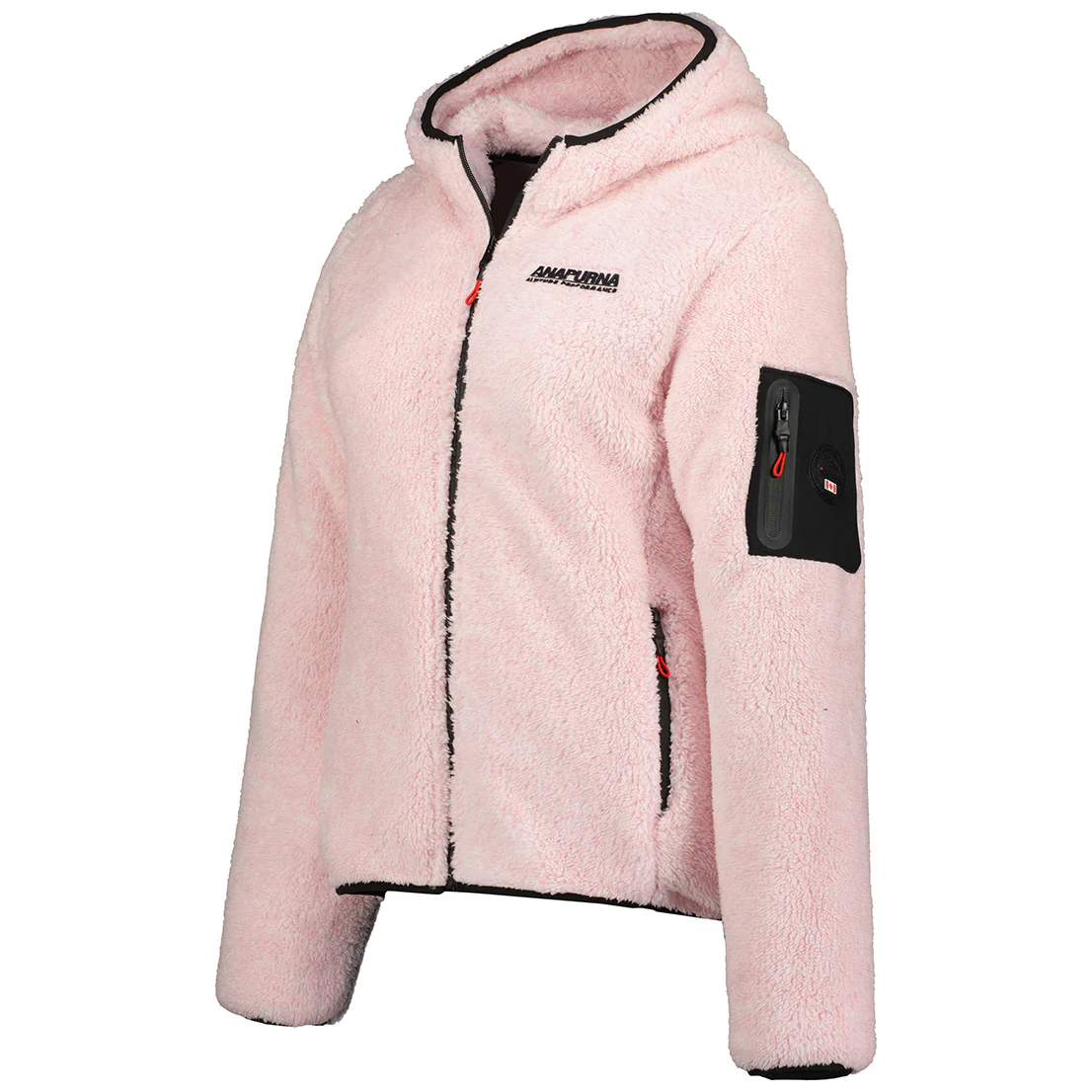 Pile da donna modello Ulebana by Geographical Norway; maglia in tessuto tecnico caldo e morbido, caratterizzata da cappuccio in pile, due tasche zip esterne, una tasca zip sulla manica esterna sinistra , distintivo in pvc sulla manica.