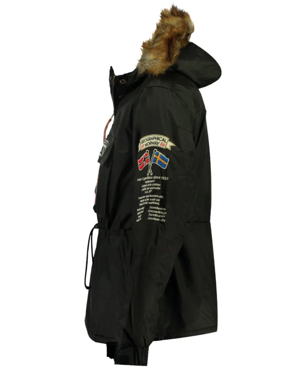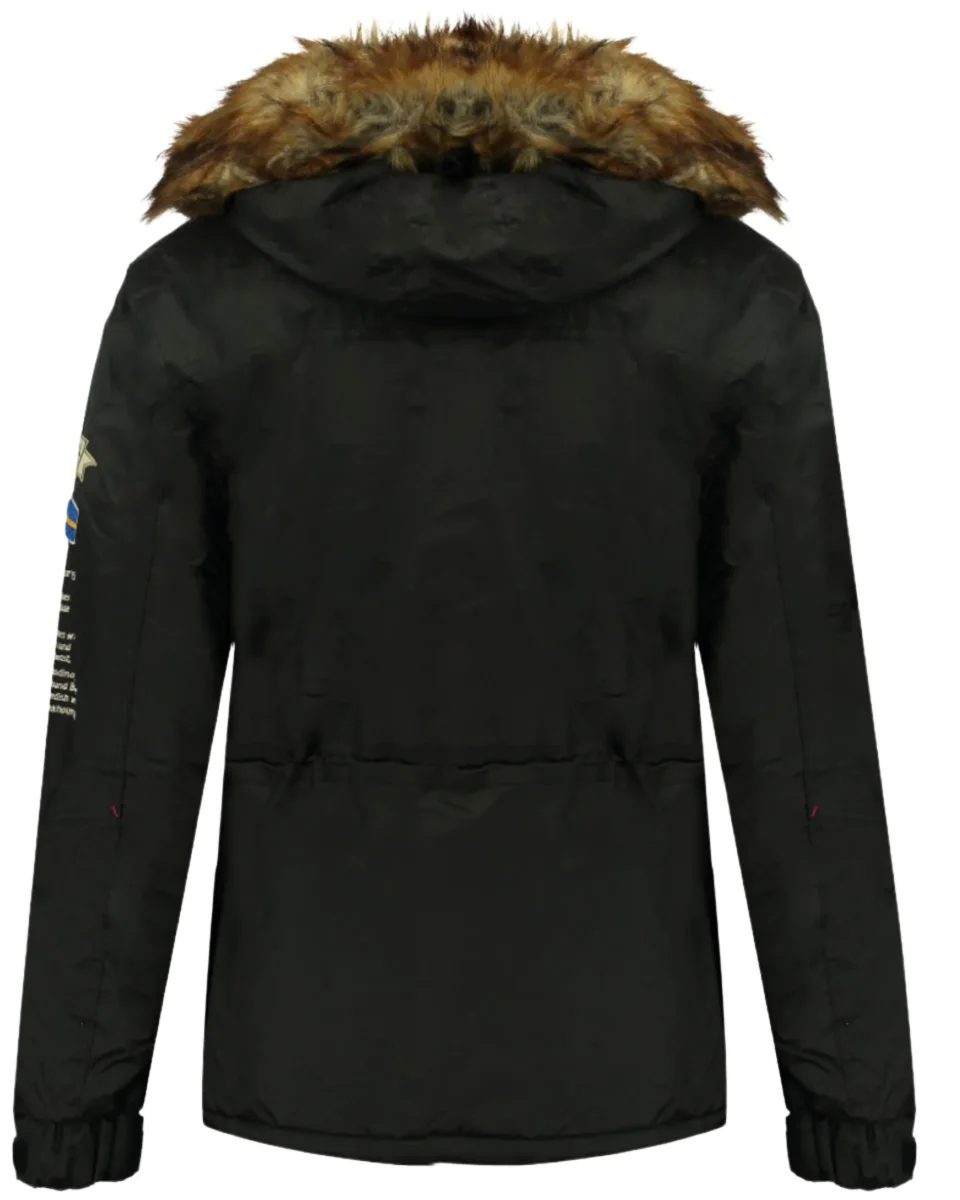 Parka imbottito con mezza zip pull-over con cappuccio fisso, pelliccia staccabile, tasche a toppa con patta in velcro ricamato. Polsini regolabili, patch e ricami sulla manica, coulisse di regolazione in vita e fondo capo.