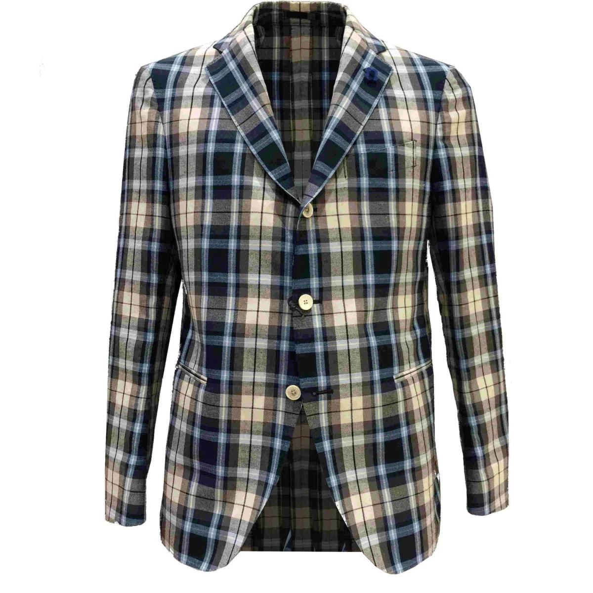 Blazer in fantasia madras, tessuto in misto lino, modello slim fit a 3 bottoni con stiratura a 2, spacchi laterali