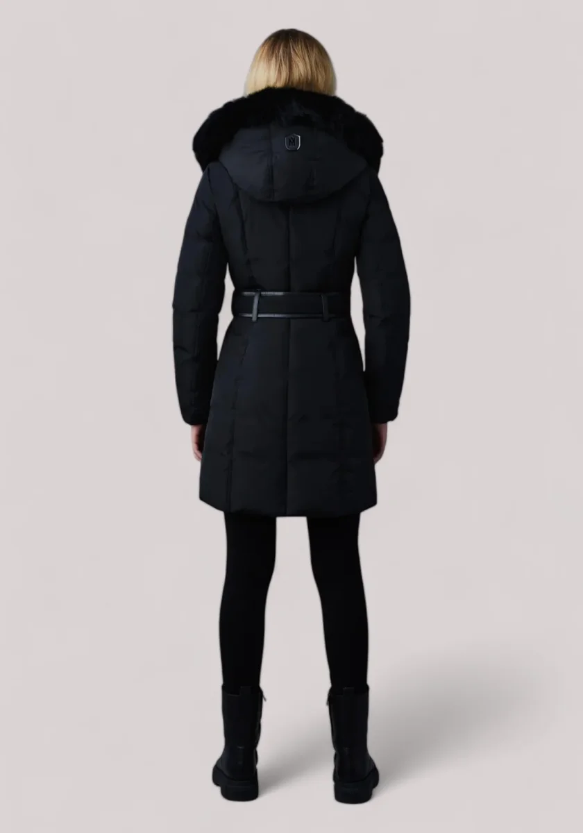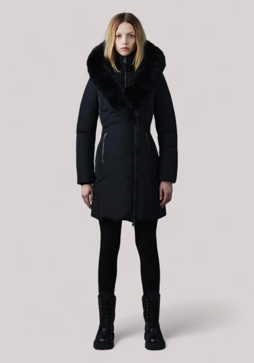 KAY è un cappotto da donna a tre quarti in piumino aderente con colletto Signature con pelliccia di volpe blu e chiusura a zip asimmetrica. Realizzato in piumino riciclato, presenta una pettorina interna con collo a costine, fermaglio del cappuccio nascosto e polsini antipioggia. Le tasche a filetto in pelle isolate, idrorepellenti e antivento aggiungono calore e funzionalità . Un capo invernale essenziale e di design, impreziosito da un taglio sartoriale direzionale.