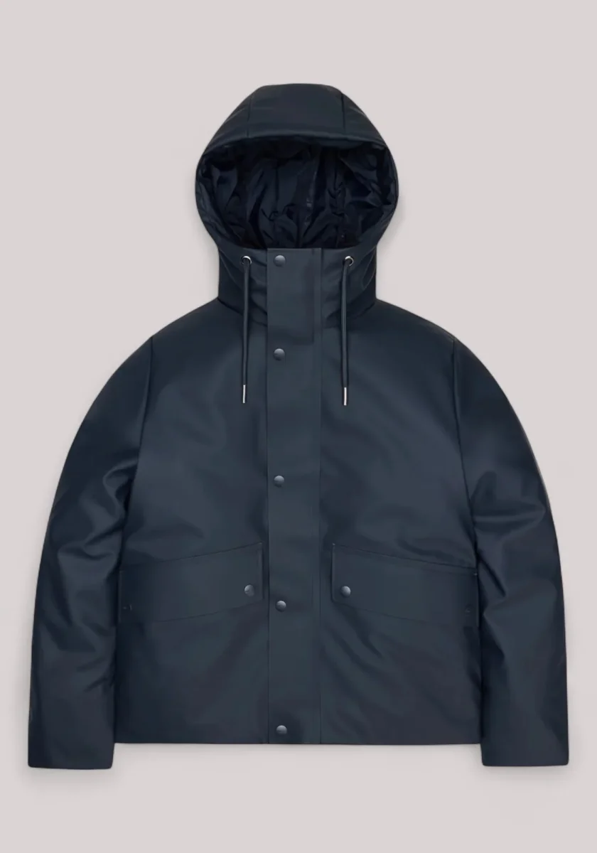 La giacca waterproof è realizzata con l’iconico tessuto PU di Rains, con una parte posteriore in tessuto forte e resistente. La mano è pulita, con un aspetto epurato e una sensazione liscia al tatto.