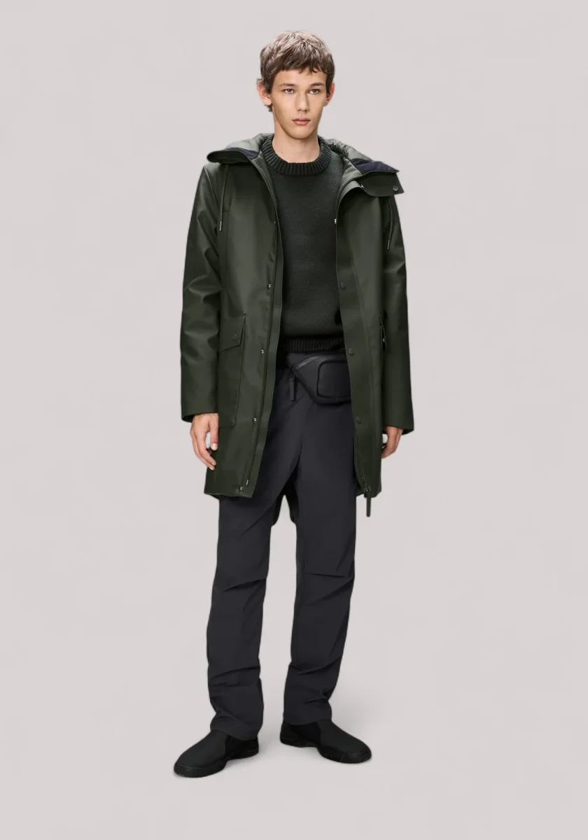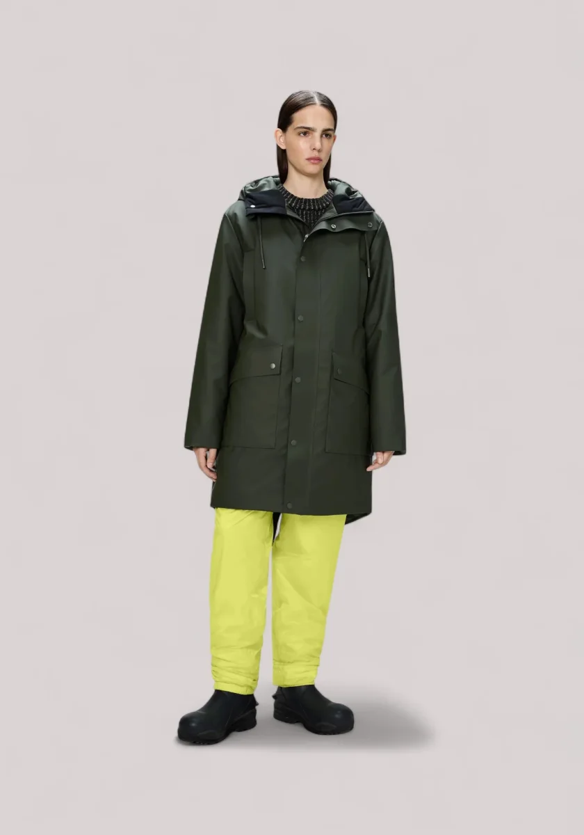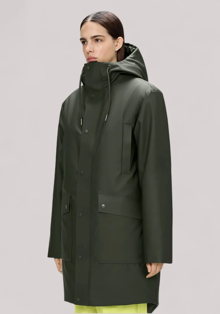 La giacca waterproof è realizzata con l’iconico tessuto PU di Rains, con una parte posteriore in tessuto forte e resistente. La mano è pulita, con un aspetto epurato e una sensazione liscia al tatto.