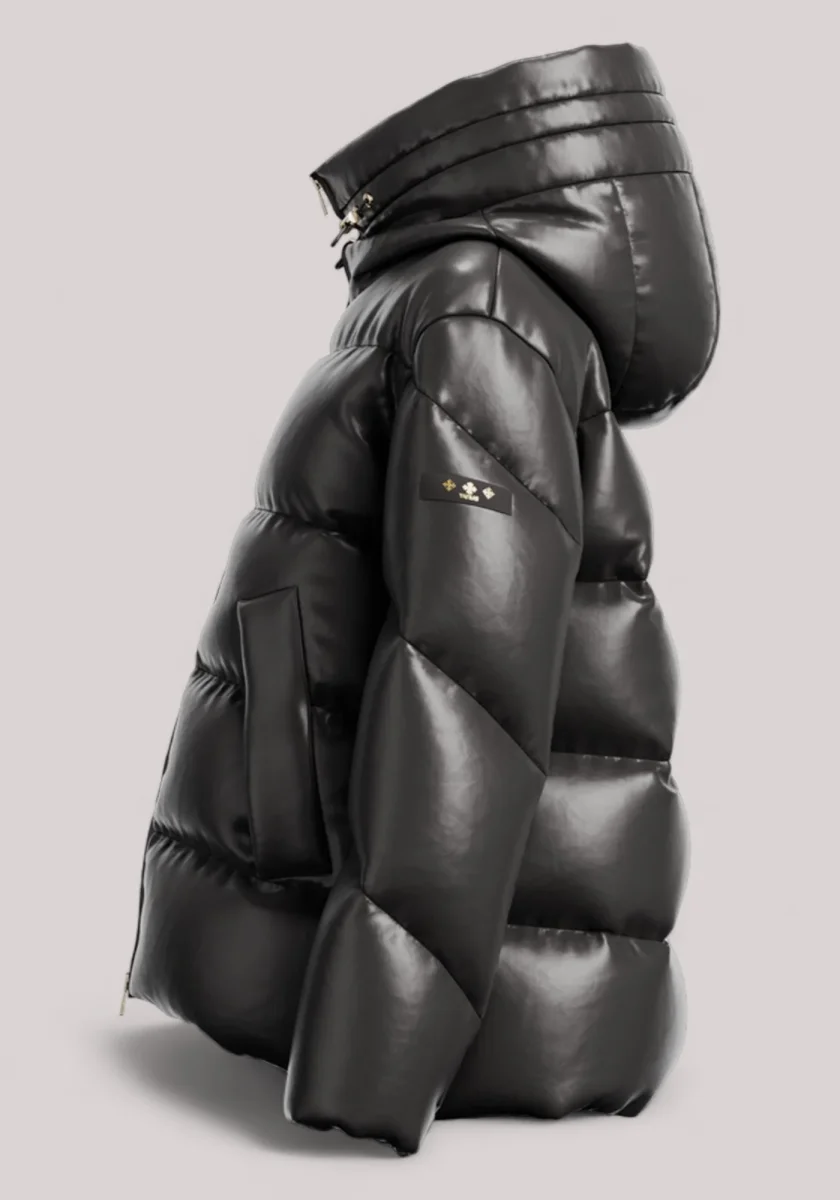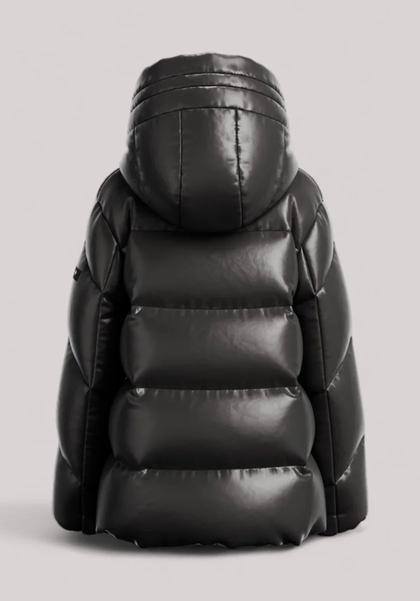 Un piumino di media lunghezza in tessuto lucido, tagliato con una silhouette ampia a trapezio per una vestibilità rilassata.