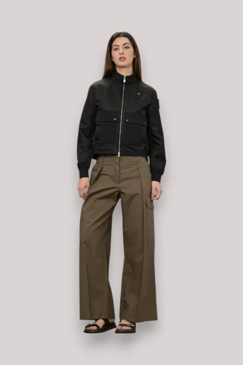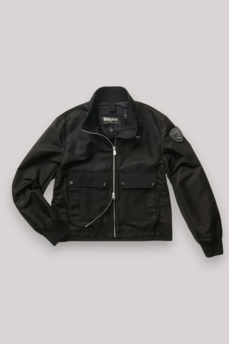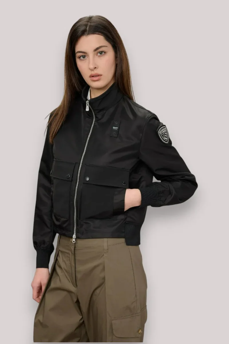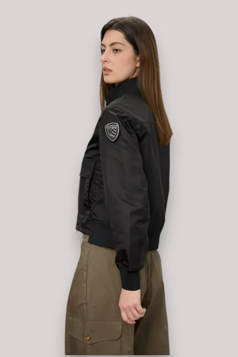 Giubbino donna dalla silhouette militare contemporanea, realizzato in nylon lucido sul fronte con inserti in neoprene tono su collo, tasche, spalle e interno maniche. La giacca unisce l’estetica della bomber con la funzionalità di ampie tasche applicate anteriori, perfette per uno stile pratico e trendy. Chiusura con zip, costine elastiche su collo, polsini e orlo posteriore assicurano comfort e vestibilità . Completano il design le tasche interne con velcro, patch ricamato e passante con logo. Un capo versatile che combina dettagli tecnici e palette colori attuali.
