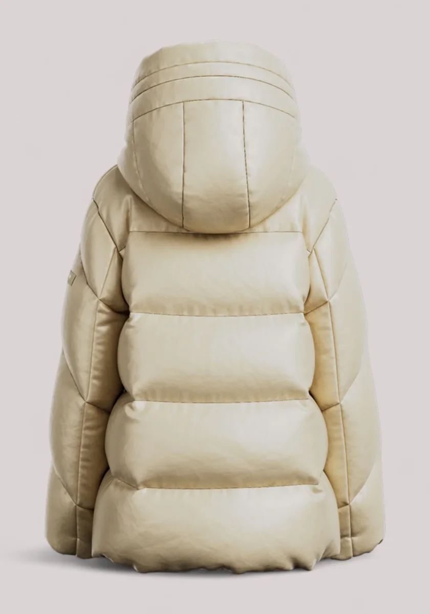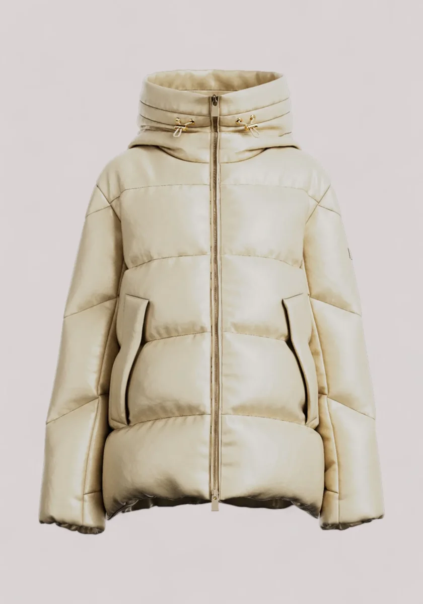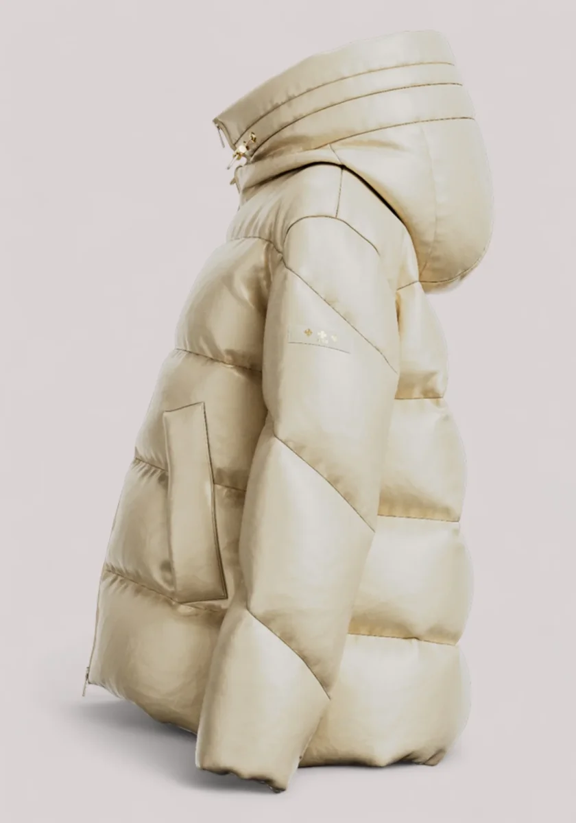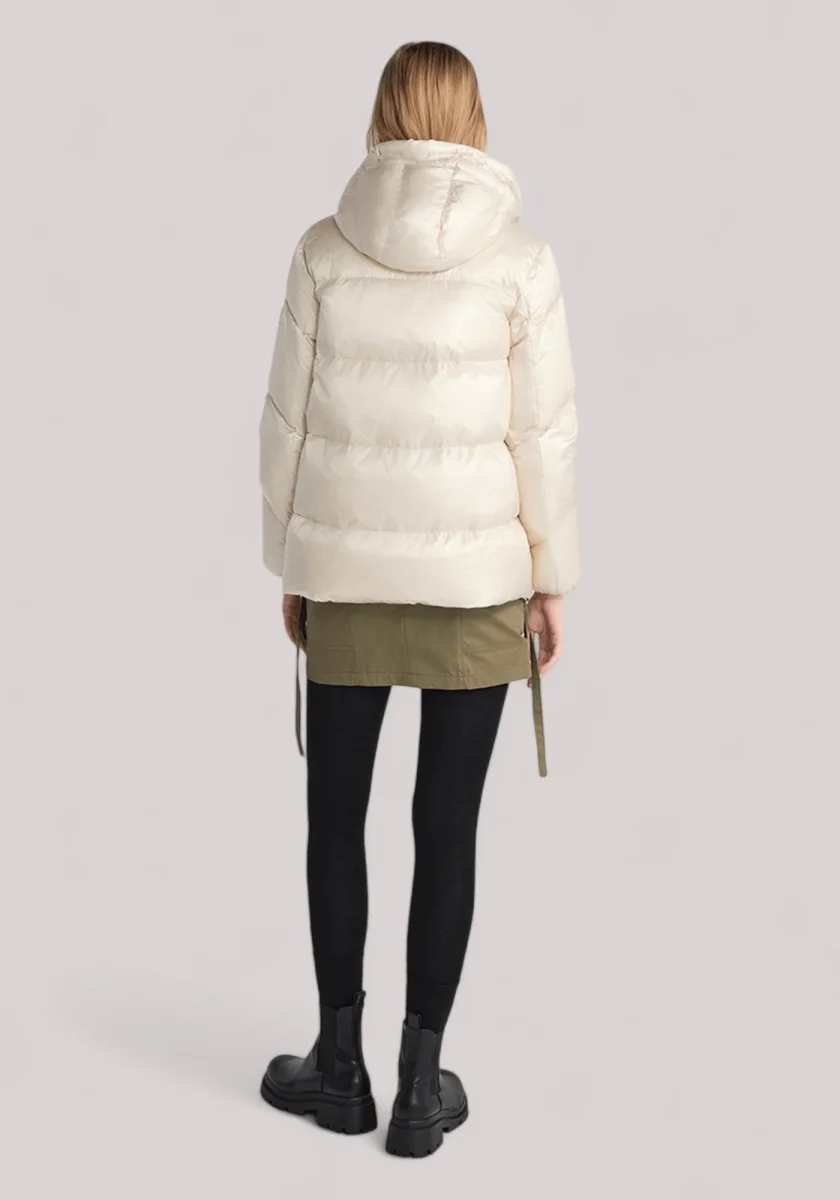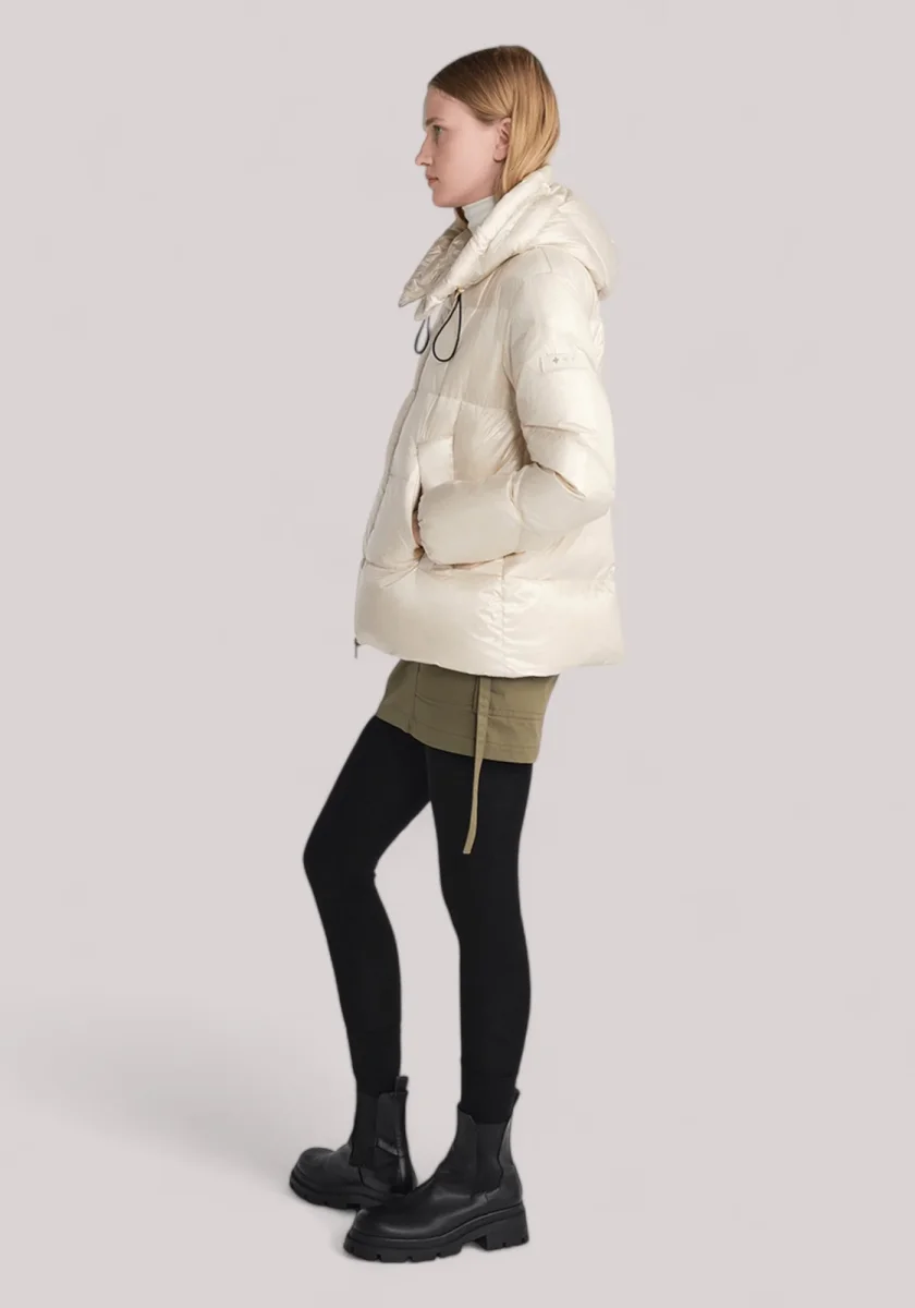 Un piumino di media lunghezza in tessuto lucido, tagliato con una silhouette ampia a trapezio per una vestibilità rilassata.