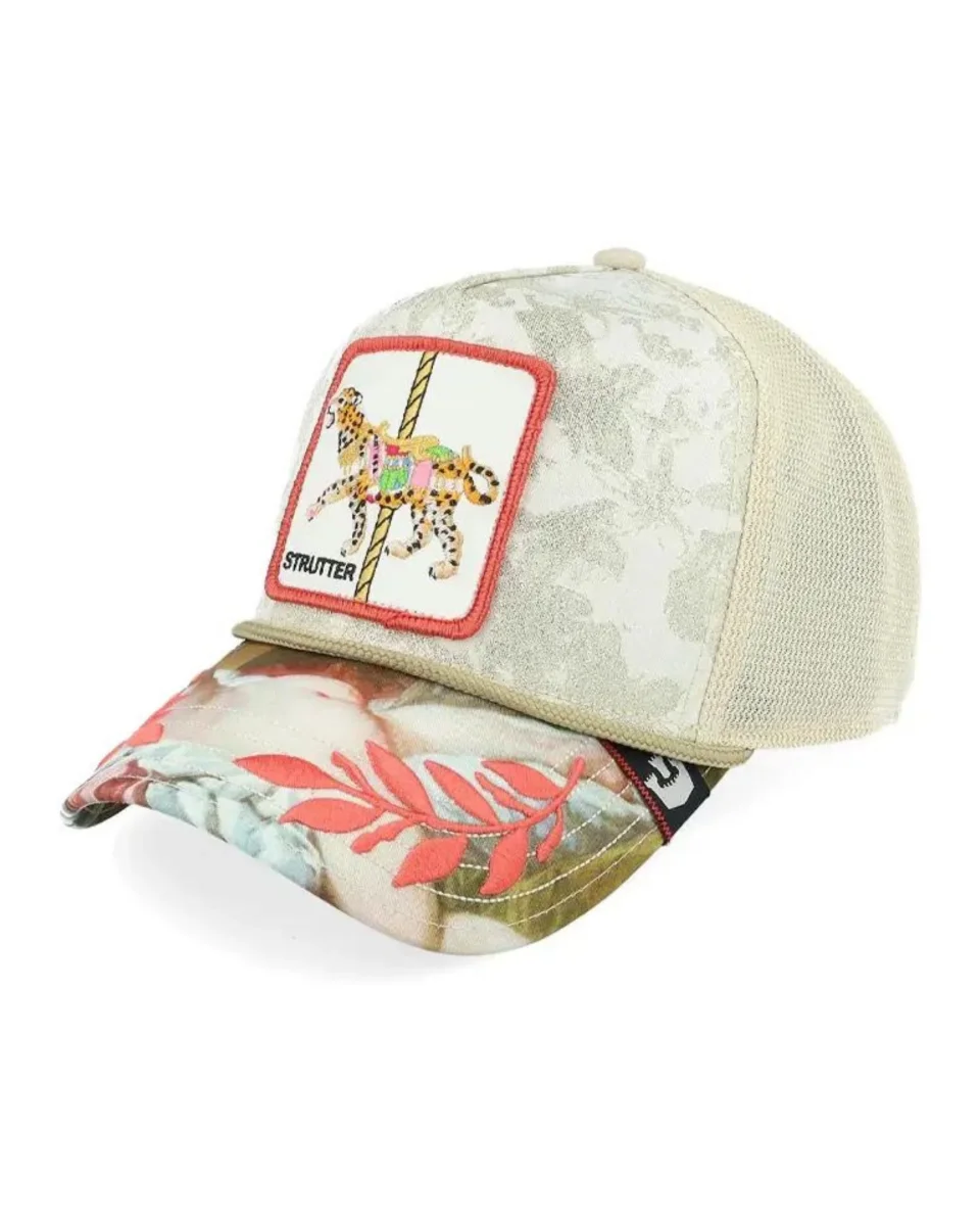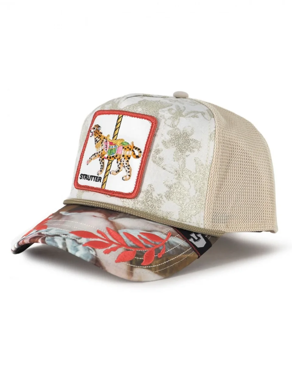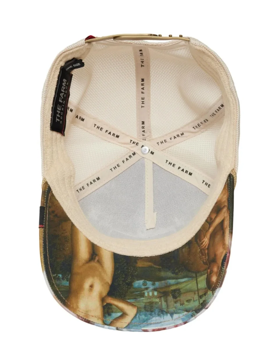 Cappellino Trucker Edizione Limitata Arte, accessorio dallo stile unico ottenuto fondendo elementi epici, estratti di dipinti classici e icone mondane. Edizione Greatest con capretta delle giostre, dettaglio dell’affresco ‘Giudizio Universale’ centrale, foglie di alloro color rosso e dettaglio azzurro sotto la tesa.
