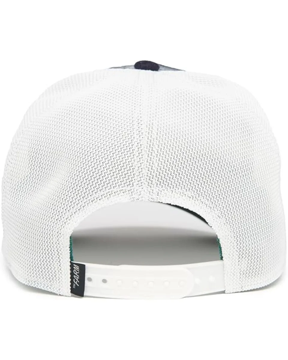 Cappello da camionista a 5 pannelli firmato Goorin Bros. Progettato con pannelli posteriori in rete ad alta densità , chiusura snapback regolabile, comoda fascia tergisudore in spugna.