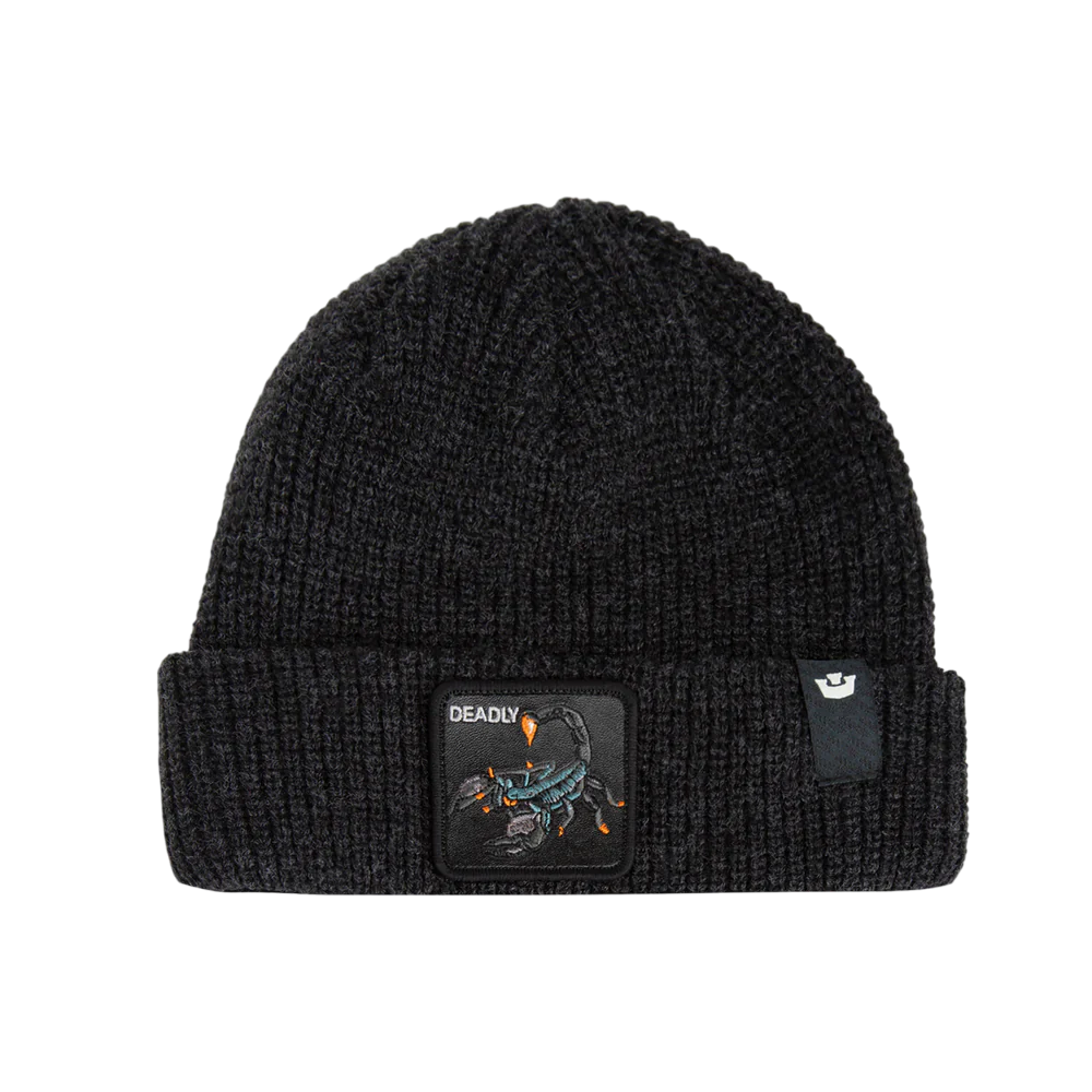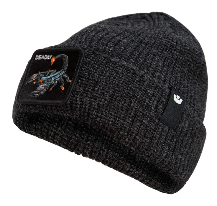 Cuffia stretta e nera con la patch di uno scorpione che punge a vista. Abbastanza caldo per l’inverno, abbastanza resistente per i guai: questa è un accessorio tagliente.