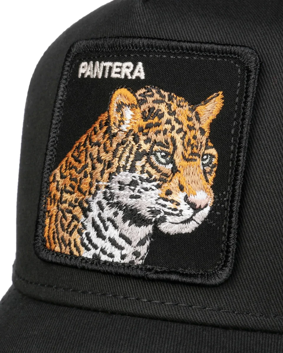 Versione Gold, cappello in doppia colorazione nero e oro, modello Pantera con patch centrale con leopardo, accessorio composto al 57% poliestere, 43% cotone.