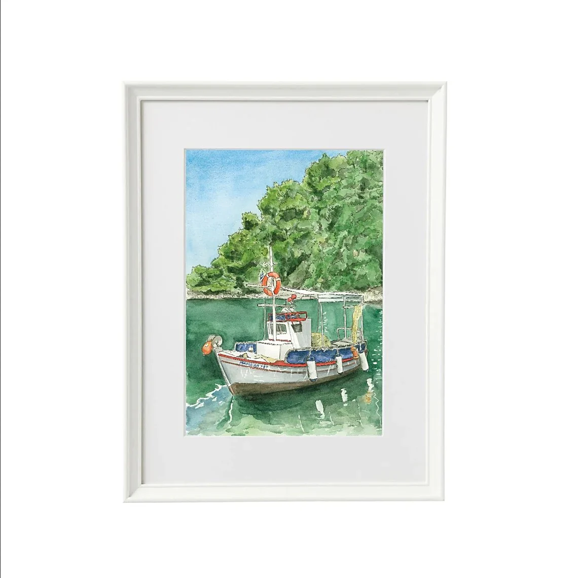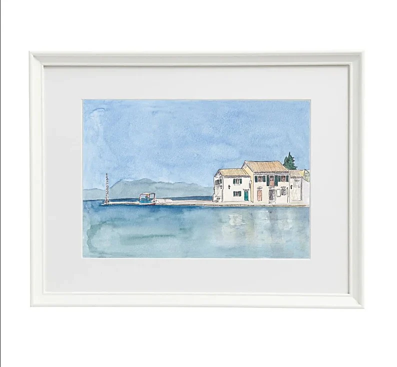 Uno dei paesini più caratteristici dell’isola di Paxos in Grecia è Loggos. Questa illustrazione ad acquerello su carta realizzata a mano da ll’artista locale Poppy Anemogiannis rappresenta la parte più iconica di Loggos. Questo porto è infatti un posto incantevole dove sedersi senza fretta e guardare le barche mentre ondeggiano dolcemente sull’acqua cristallina dello Ionio.