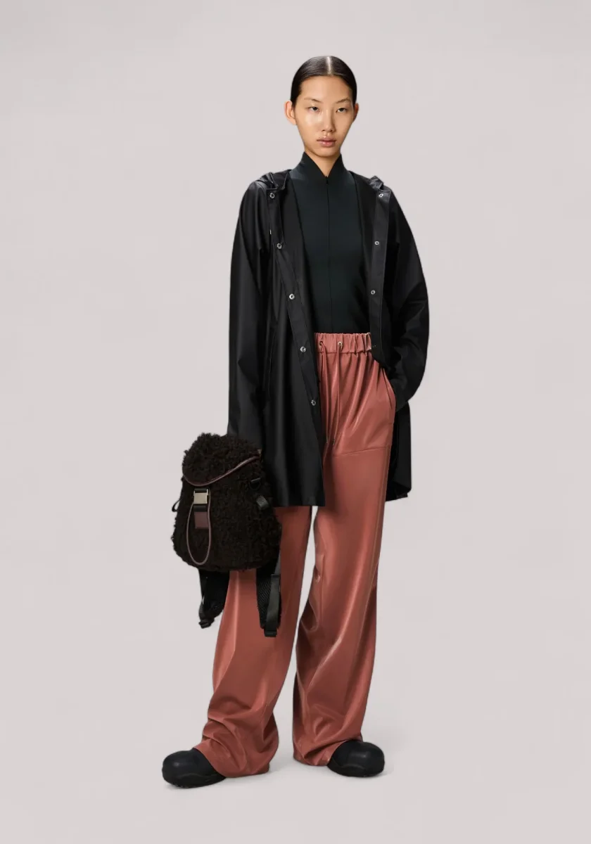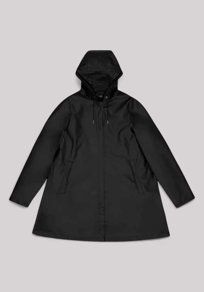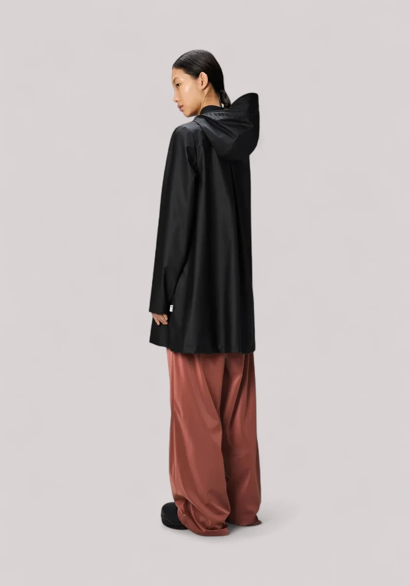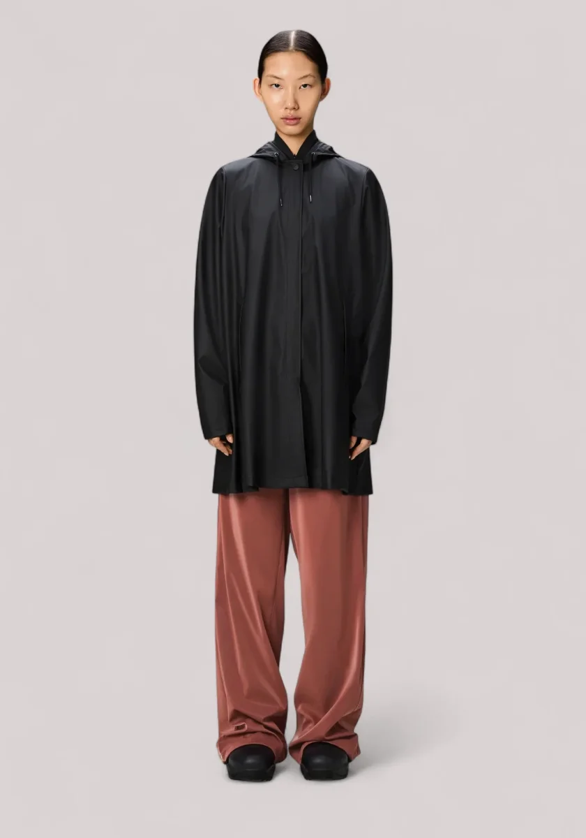 La A-Line W Jacket è realizzata nell’iconico tessuto PU di Rains e presenta cuciture nastrate, che rendono la giacca resistente all’acqua e al vento. Il finish è leggero, morbido al tocco