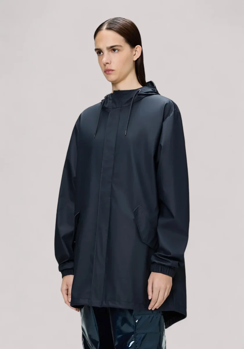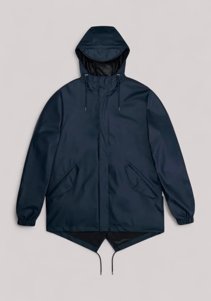 Il Fishtail Jacket è un impermeabile unisex. È caratterizzato da un’estetica essenziale e dall’orlo a coda di pesce con coulisse.