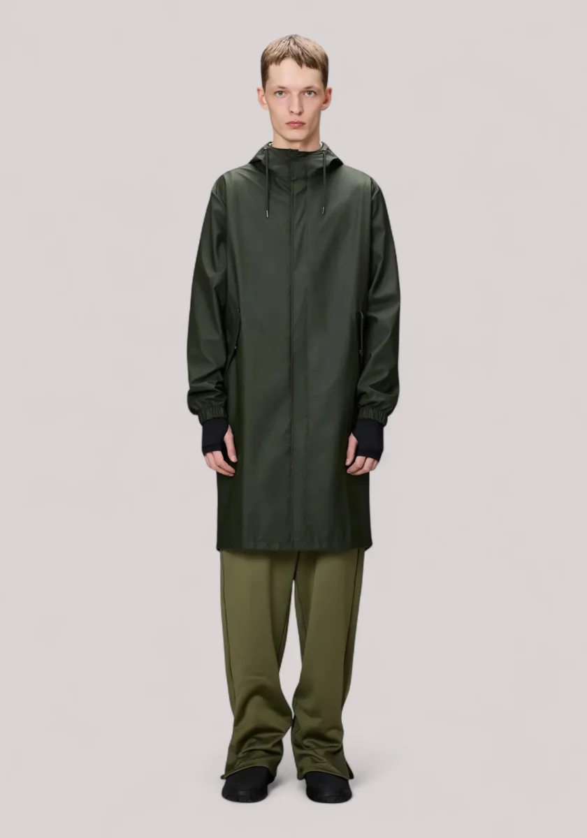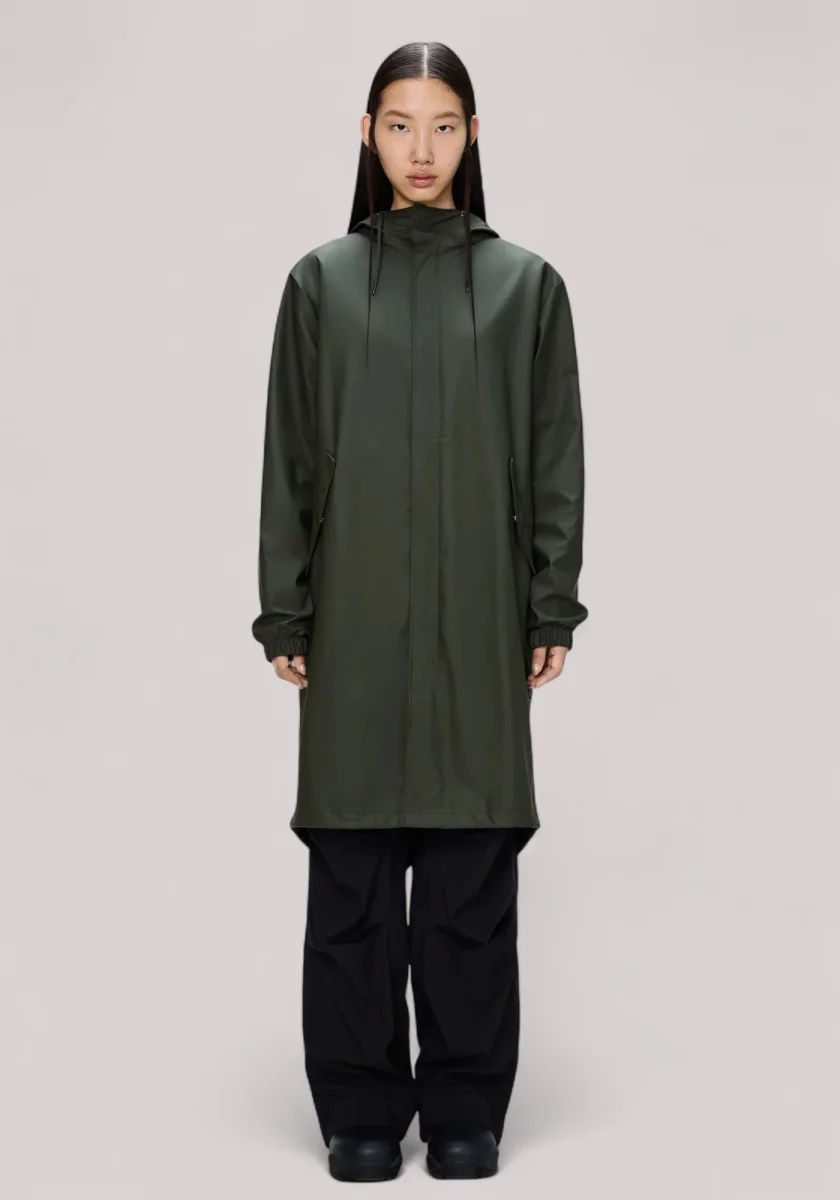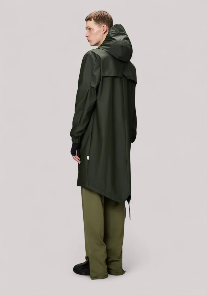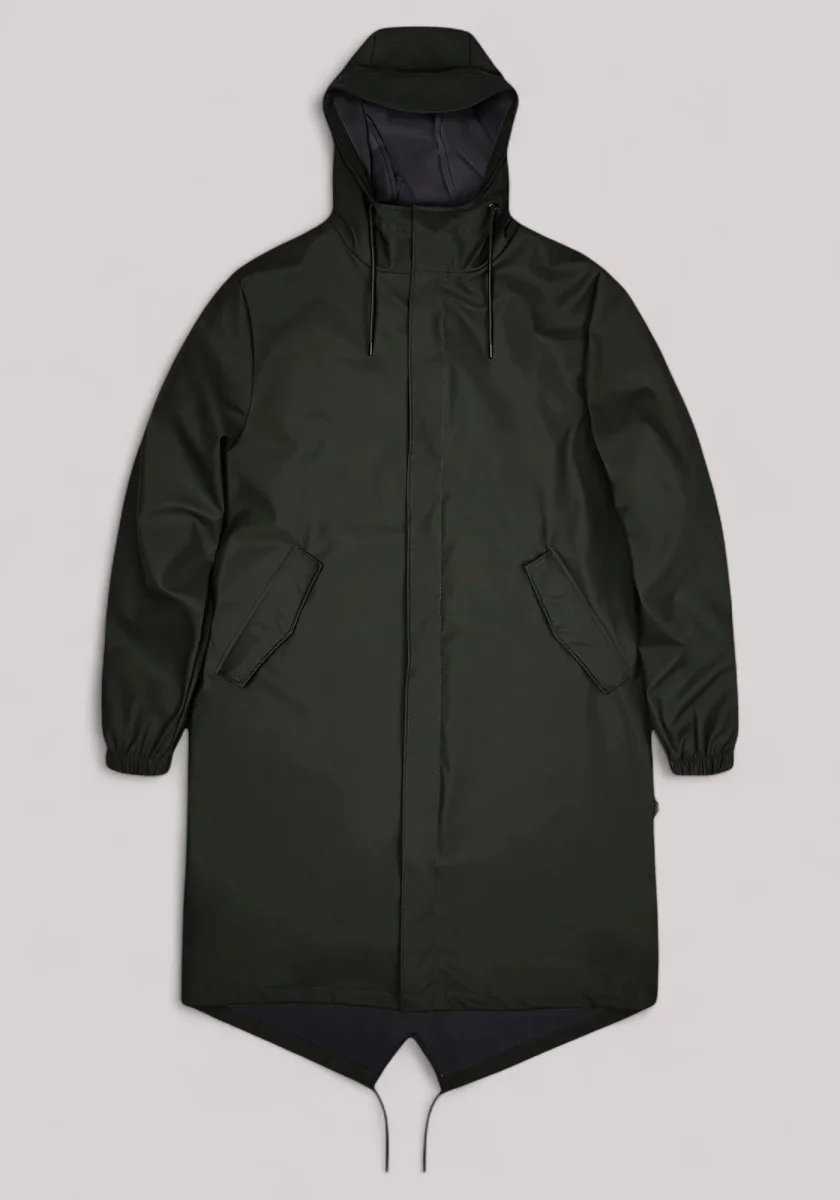 Il Fishtail Parka è un impermeabile unisex. È caratterizzato da un’estetica essenziale e dall’orlo a coda di pesce con coulisse con lunghezza parka.