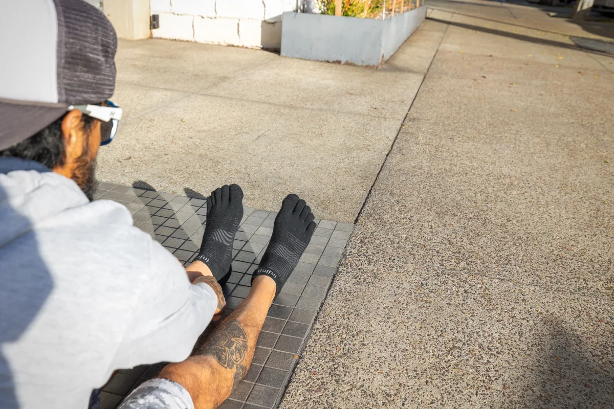 Calze Injinji Run Lightweight No-Show, un modello a cinque dita specificamente progettato per la corsa. Le principali caratteristiche di queste calze sono la leggerezza e la vestibilità a scomparsa, ideale per chi cerca una protezione minima dalle vesciche senza aggiungere volume al piede.