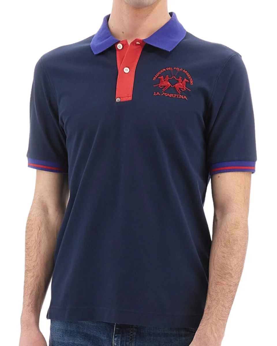 Polo per uomo La Martina modello vmp005, realizzata in cotone; manica corta, chiusura la collo con tre bottoni, colletto stile polo, logo in tono a contrasto sul petto in alto a sinistra.