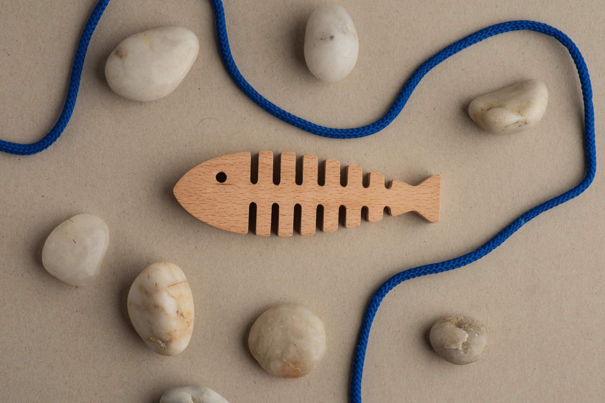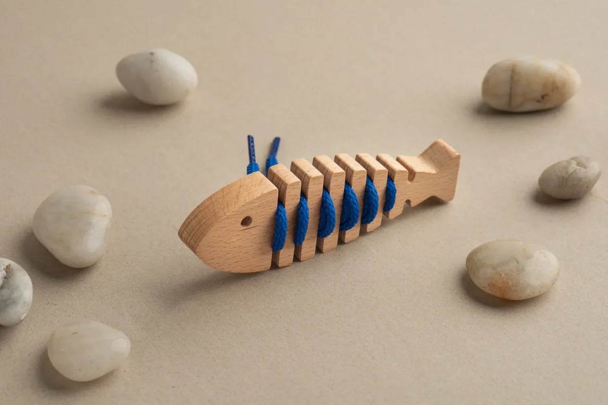 Un allegro gioco per la motricità fine in legno realizzato appositamente per essere sicuro per i bambini e rispettoso dell’ambiente che delizierà con la sua eccellente maestria e la sua originalità . In questa serie di giocattoli per la motricità fine, i bambini sono incoraggiati a creare modelli e combinazioni e sviluppare le loro abilità di motricità fine. Creando modelli attraverso il processo di gioco, i bambini praticano la coordinazione dei piccoli muscoli delle mani e delle dita, nonché la coordinazione occhio-mano. La lisca di pesce è un tema del giocattolo molto caro ai bambini. Le diverse forme dei pesci e i colori vivaci dei lacci susciteranno il loro interesse e sono una proposta decorativa unica per la cameretta dei bambini.
