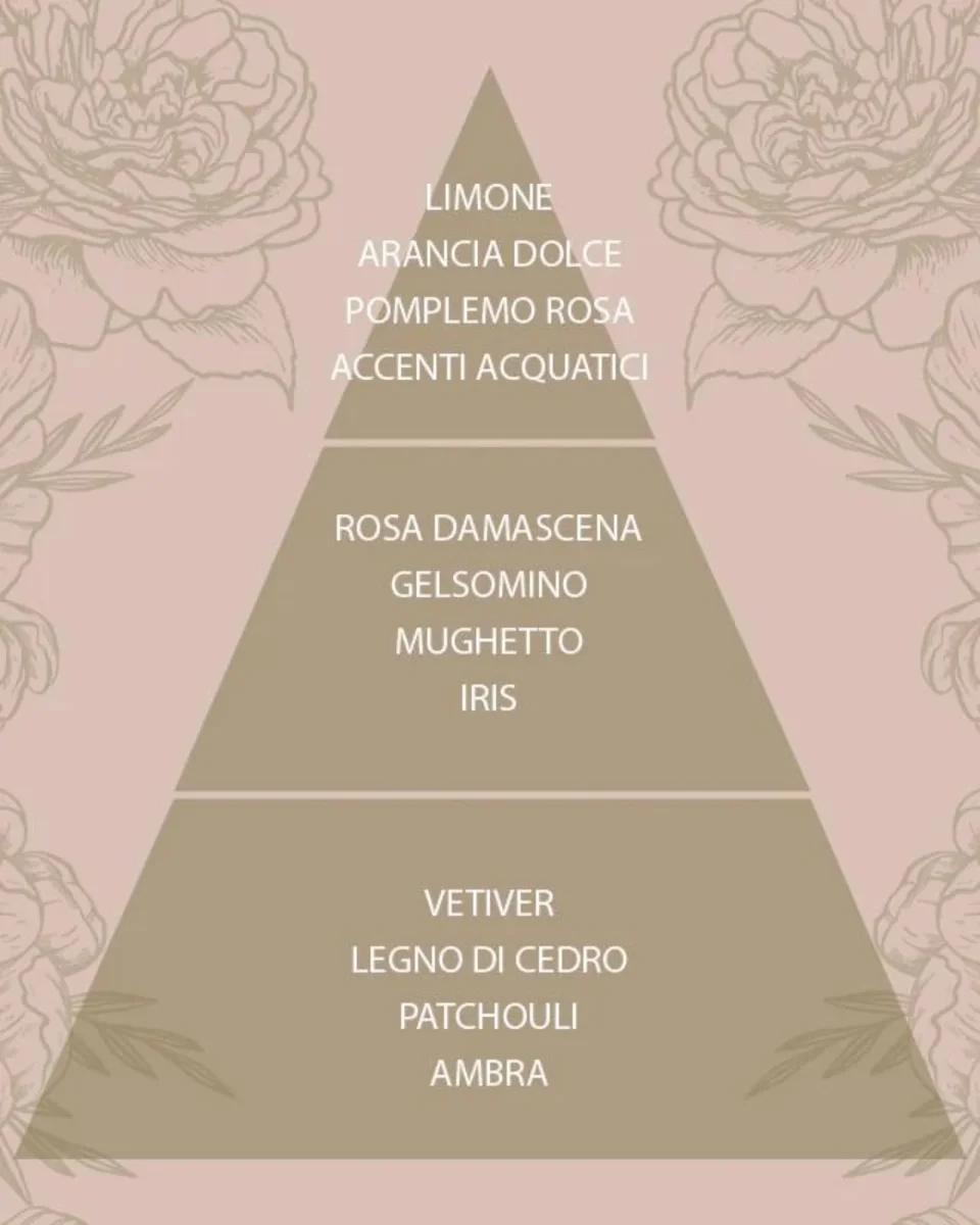 Nota fiorita, accordo acquatico – Un bouquet di rose rosa e piccoli fiori bianchi di mughetto, in sintonia con i petali di magnolia, l’eleganza per eccellenza.