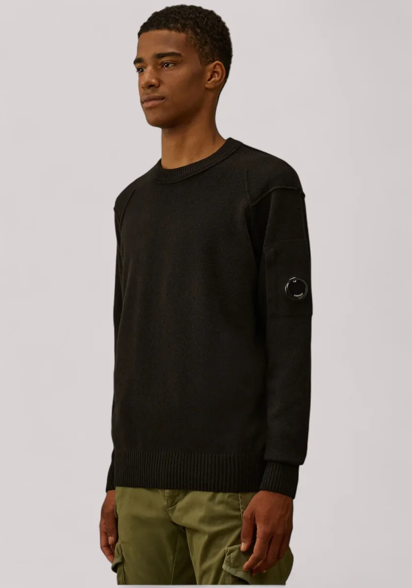 Maglione girocollo realizzato in Lambswool GRS. La certificazione Global Recycled Standard garantisce il rispetto di criteri ambientali e sociali in tutte le fasi della filiera. Il capo presenta l’iconica Lente di C.P. Company, cuciture a contrasto, polsini e orlo a costine. Finezza 7. Regular fit.