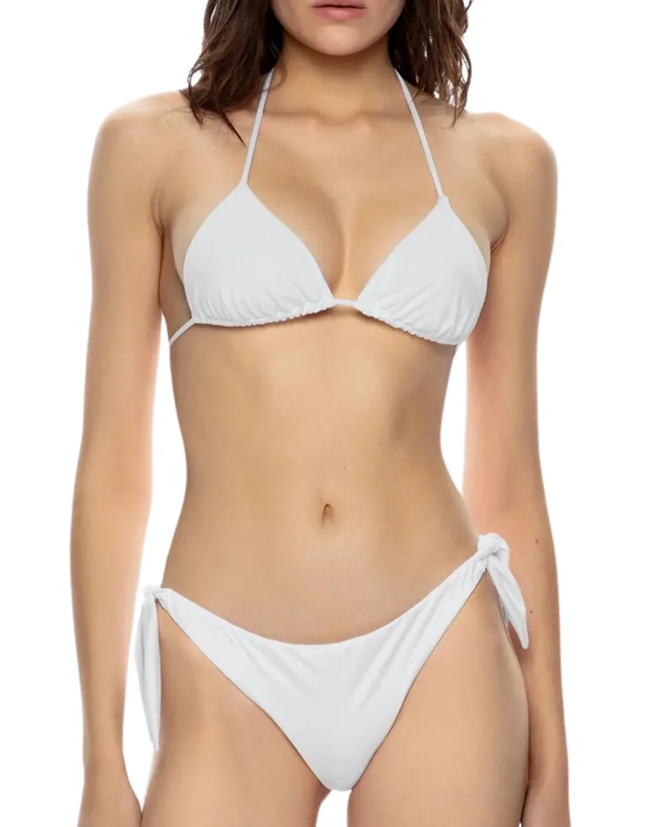 Bikini triangolo dotato di imbottitura estraibile, in tessuto lycra bianco.