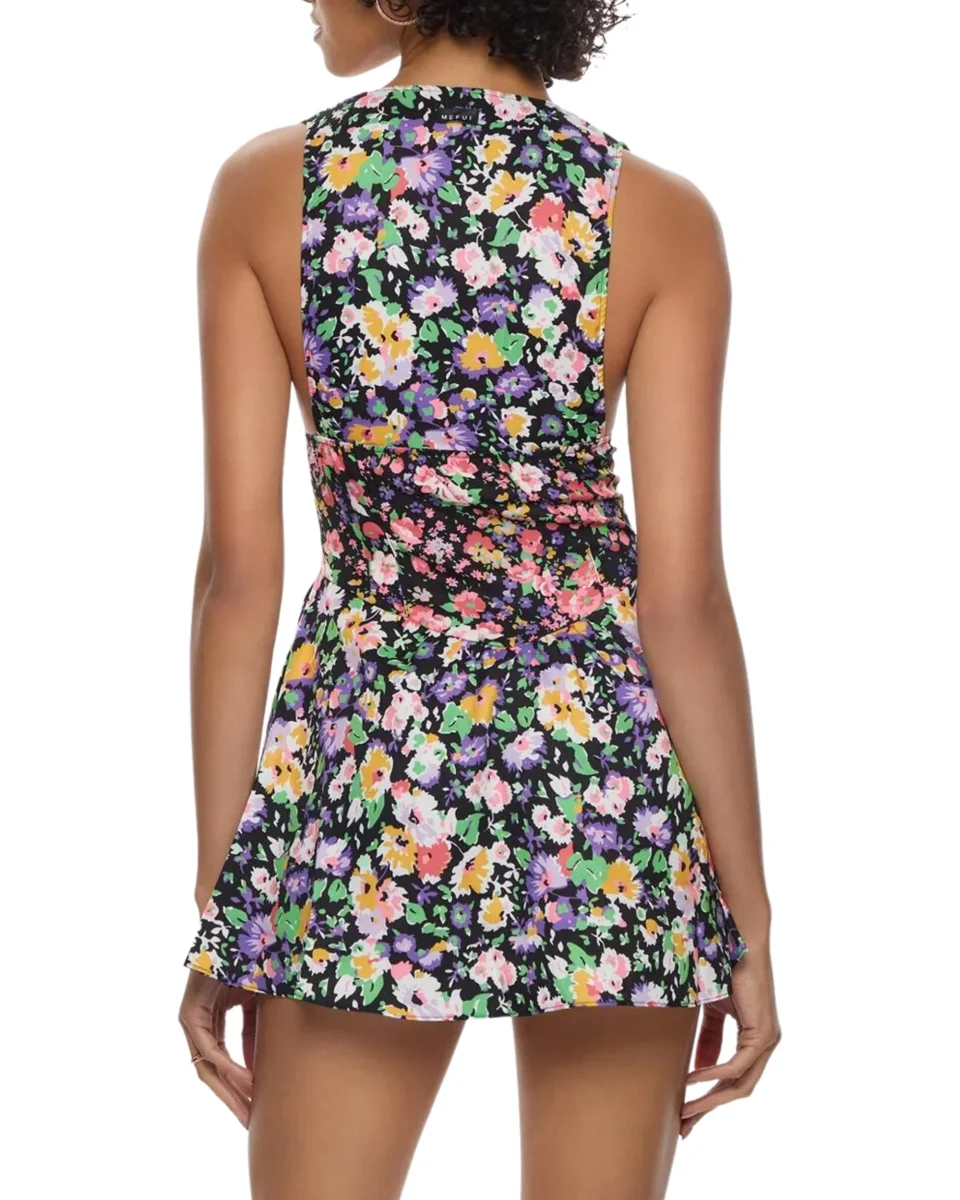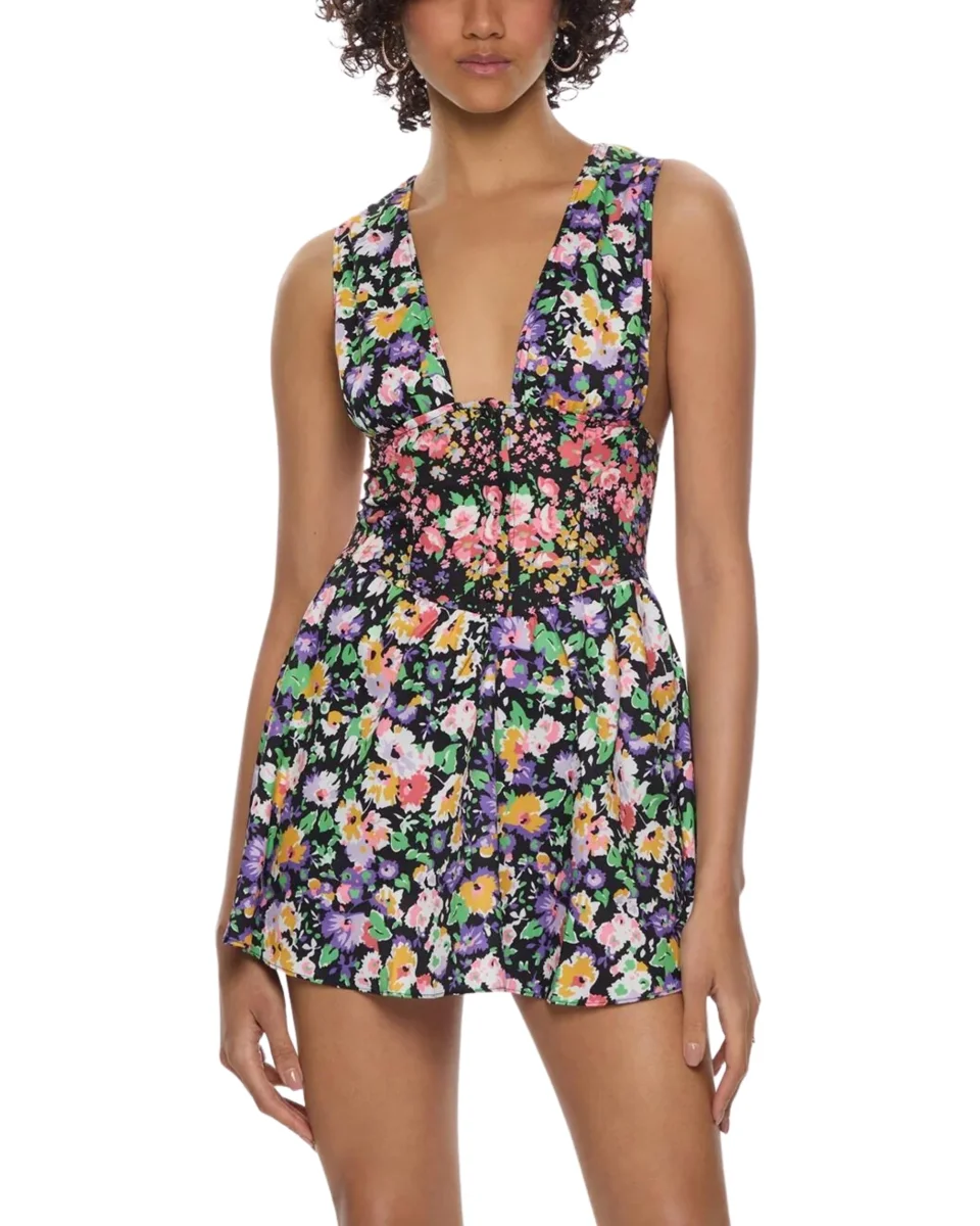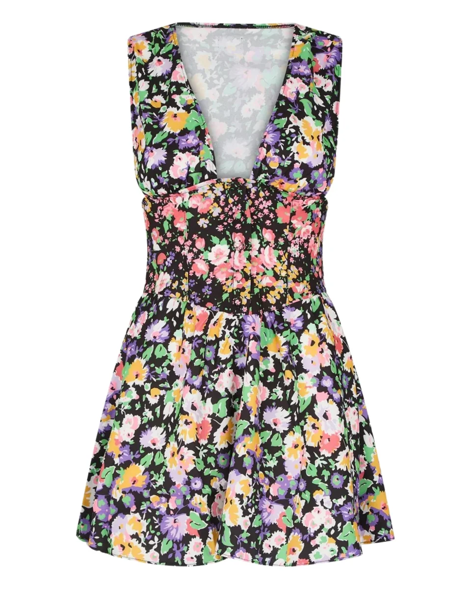Vestito corto in tessuto simil cotone a fantasia dotato di chiusura con bottoncini sul davanti, realizzato con stampa all-over.