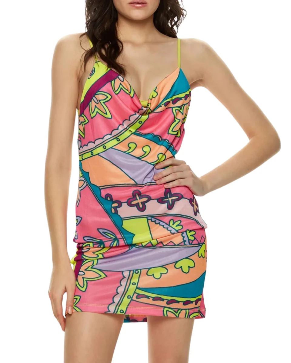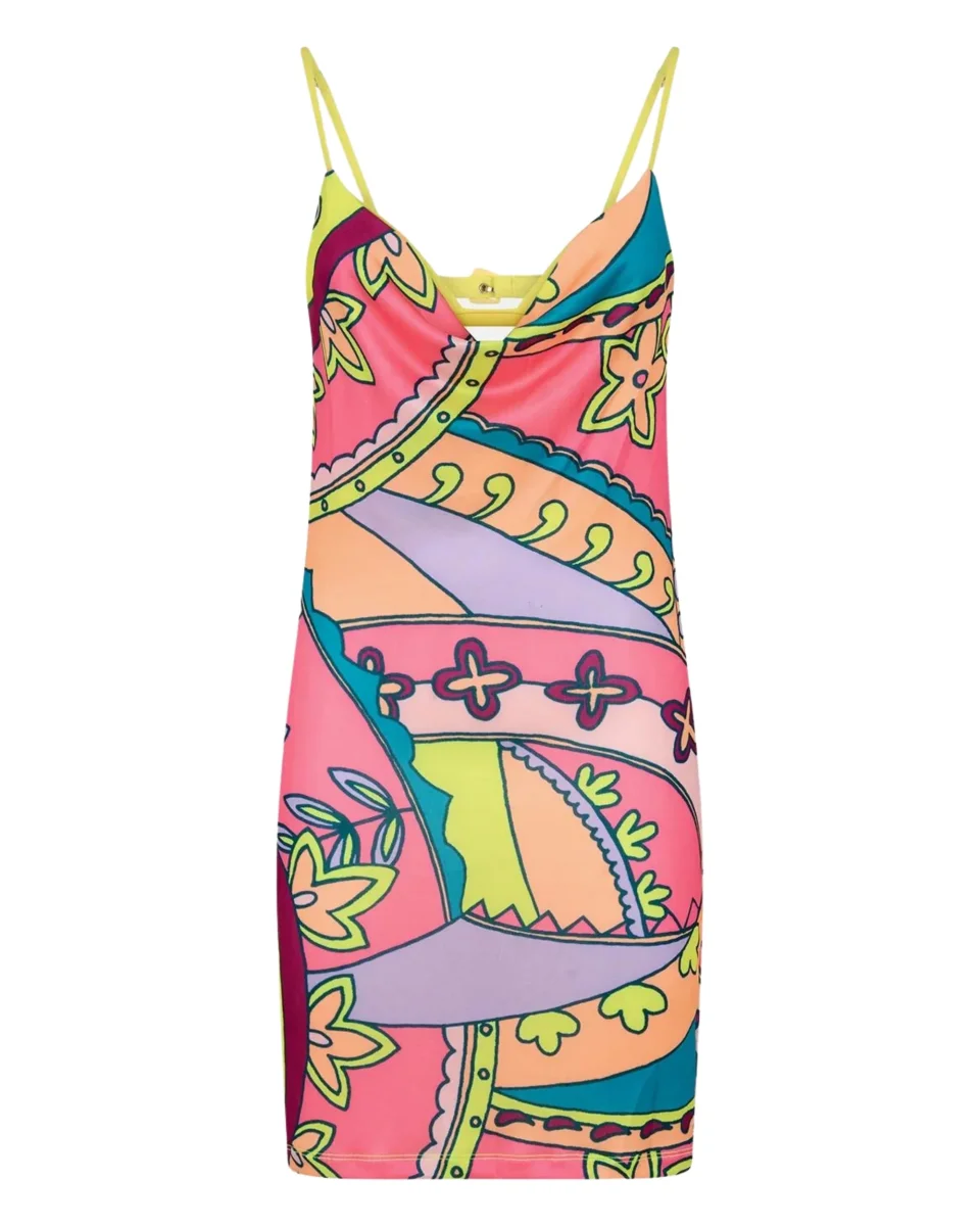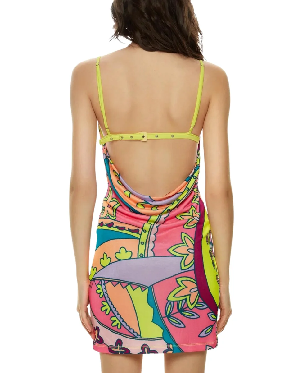 Vestito corto in tessuto jersey elasticizzato a fantasia, dotato di chiusura con fibia.