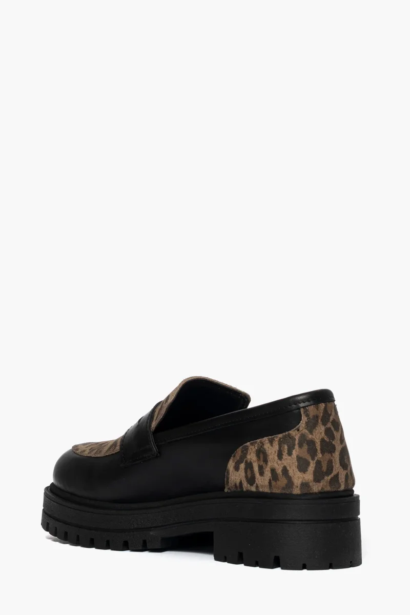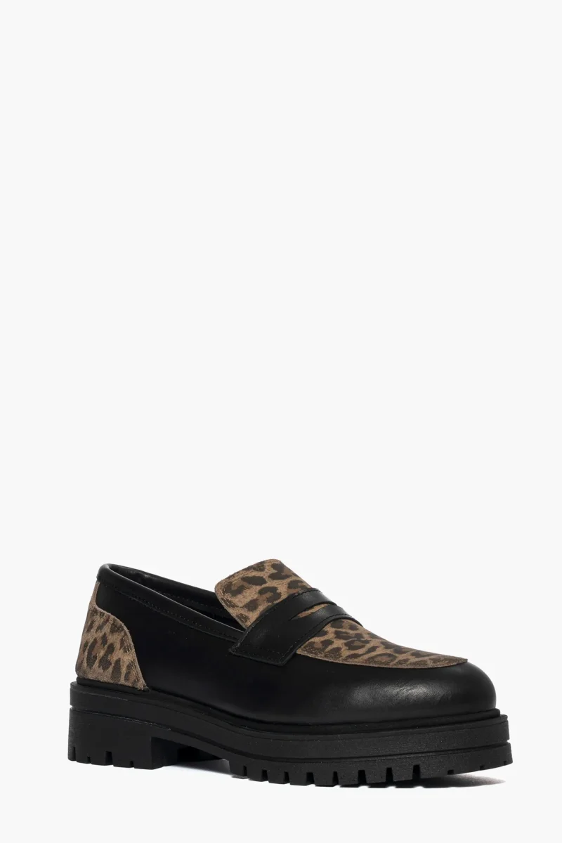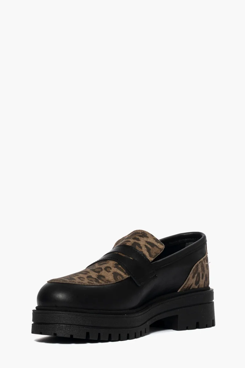 Mocassino in pelle nero e pelle animalier, suola in gomma nera, altezza 5, interni in similpelle, calzano regolari.