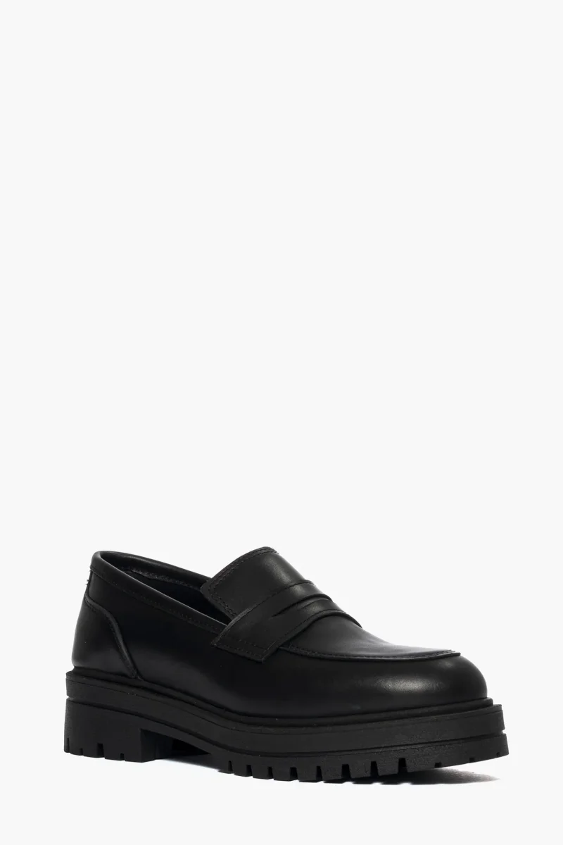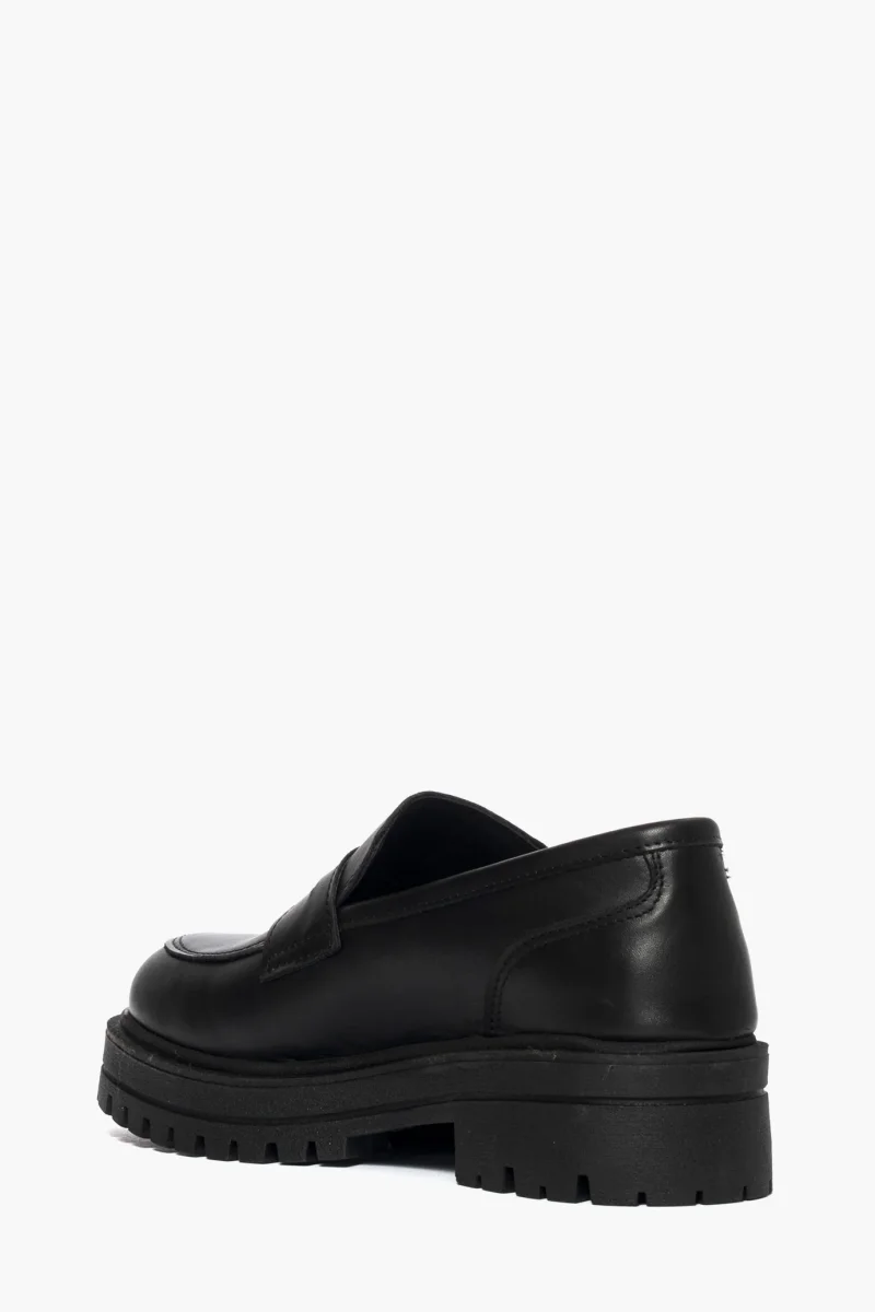 Mocassino in pelle nero, suola in gomma nera, altezza 5, interni in similpelle, calzano regolari.