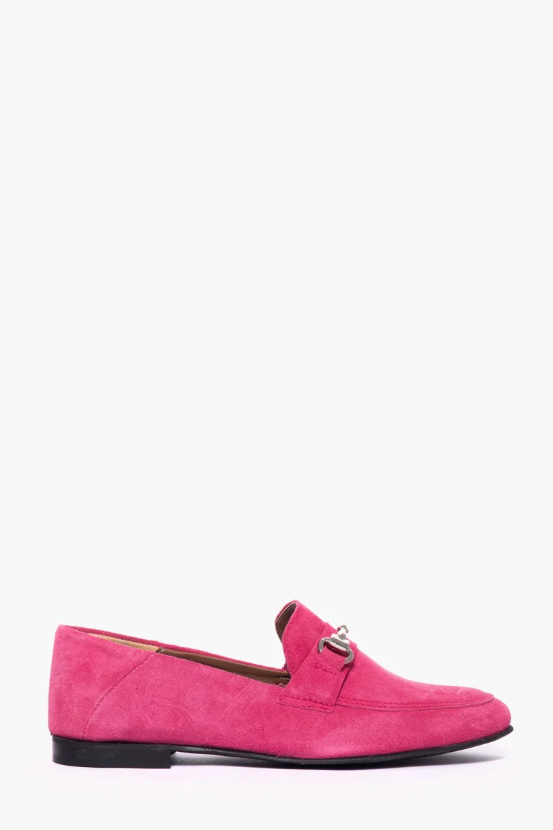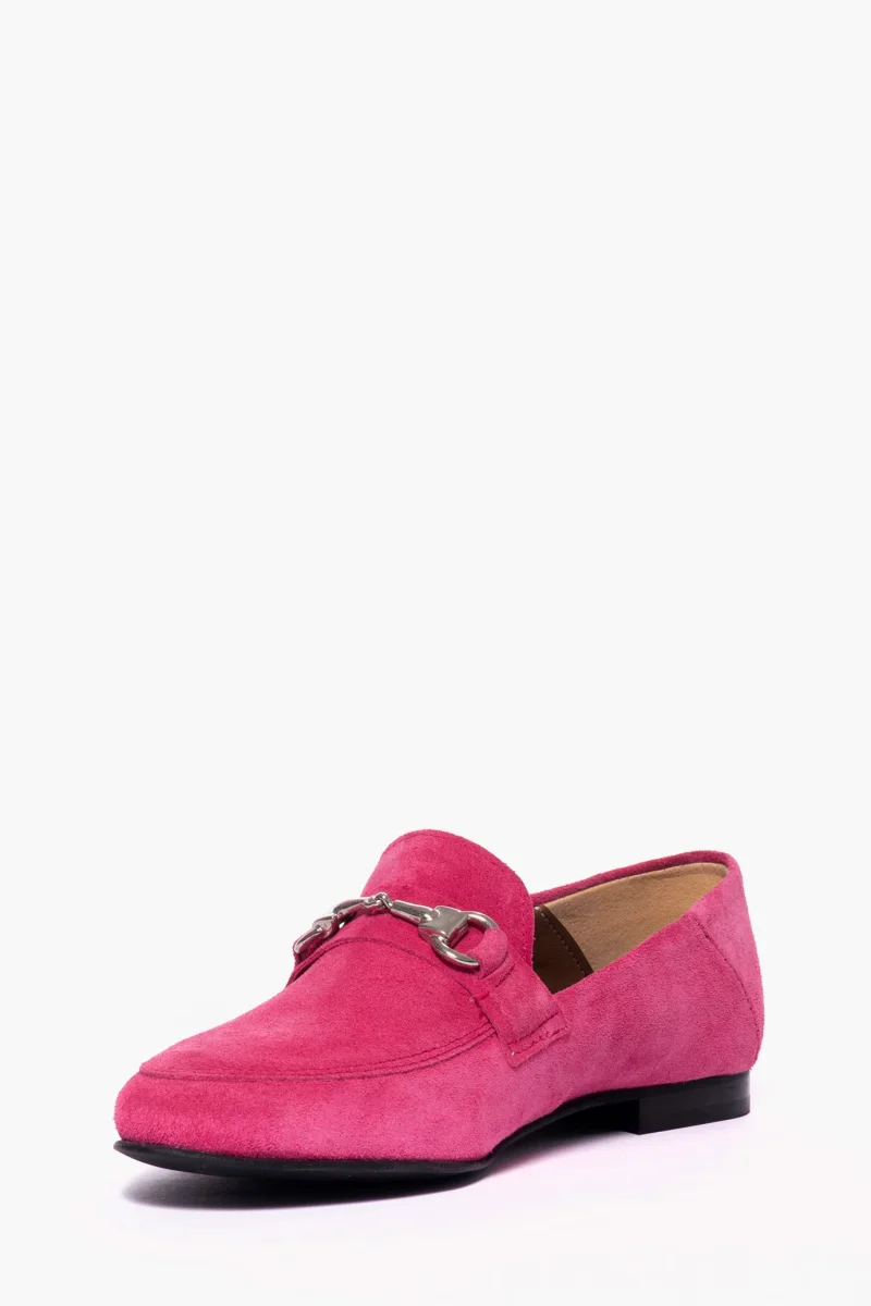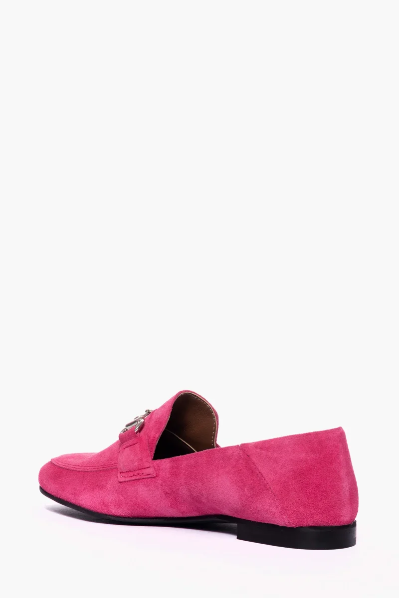 Mocassino in camoscio fucsia, morsetto nel colore argento, interni e sottopiede in similpelle, suola in tunit neutra spazzolata, tacco altezza 3 cm. Calzata regolare, comode e facili da mettere per qualsiasi occasione o outfit. Calzature realizzate in modo artigianale, rigorosamente Made in Italy.