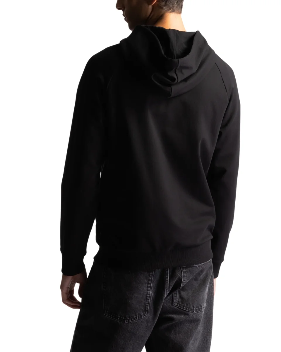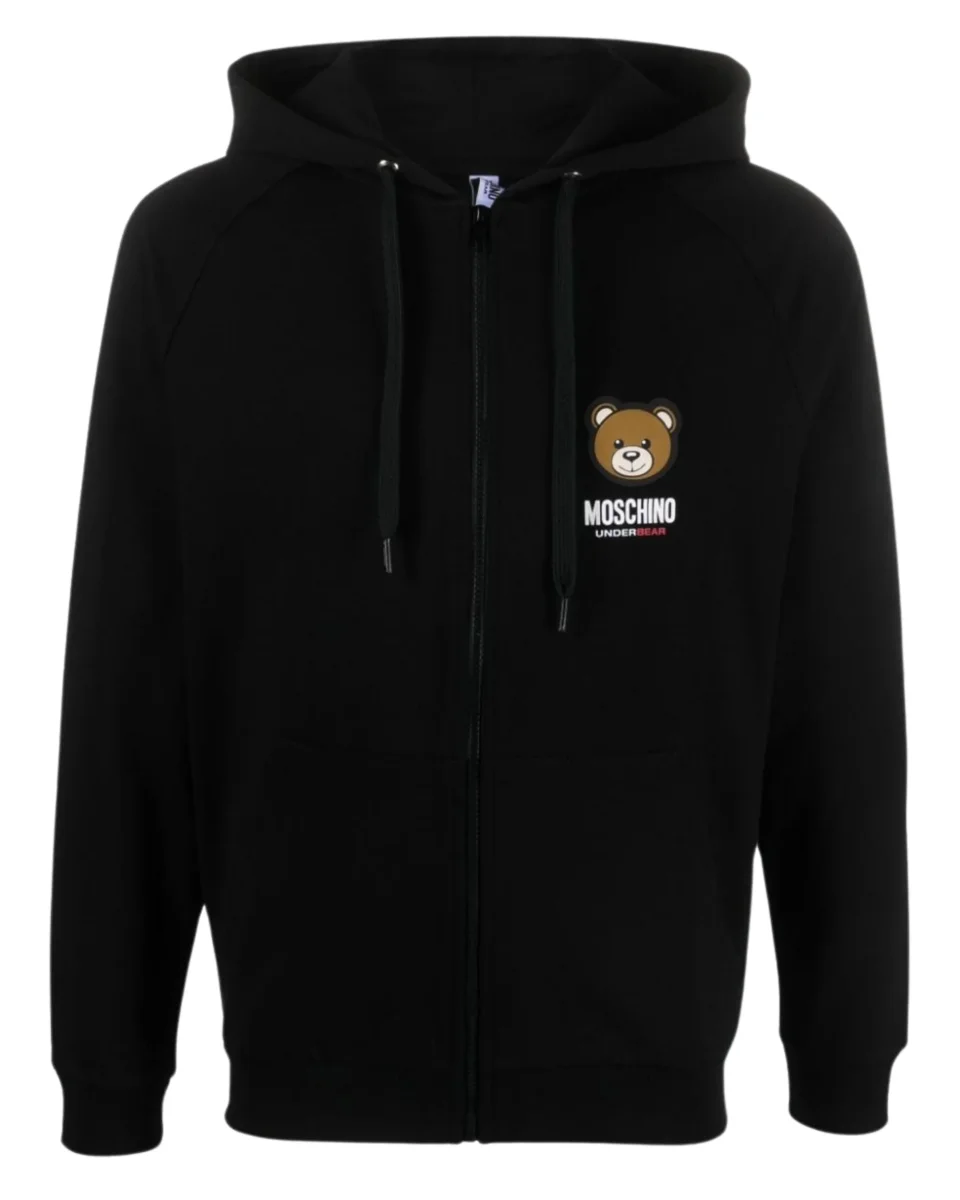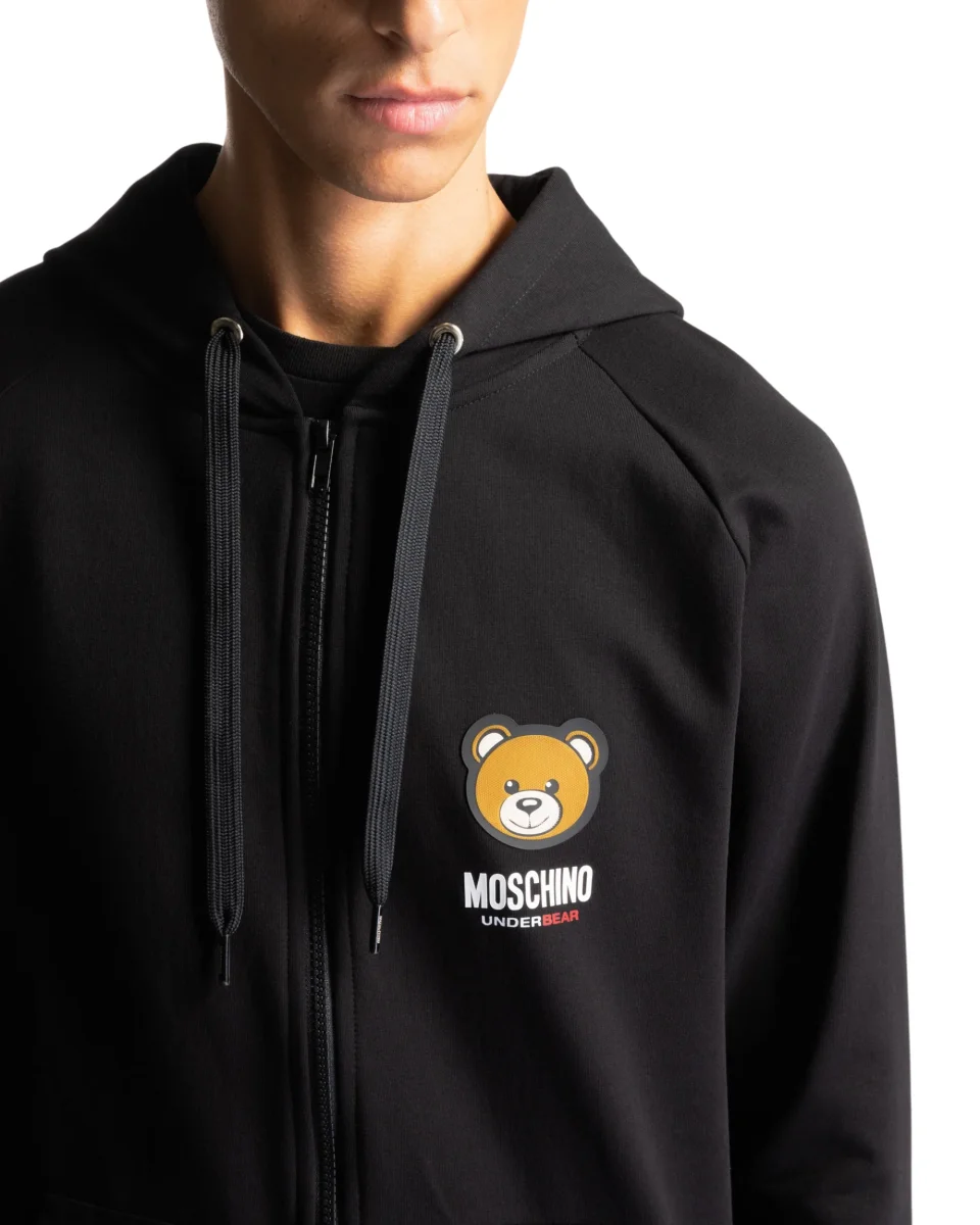Felpa Moschino con chiusura zip completa e cappuccio con culisse regolabile.
