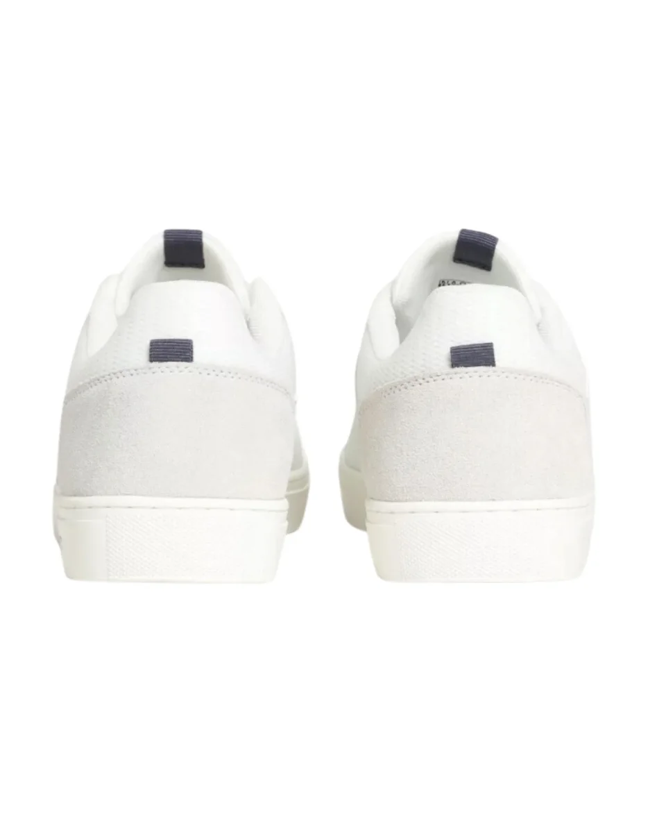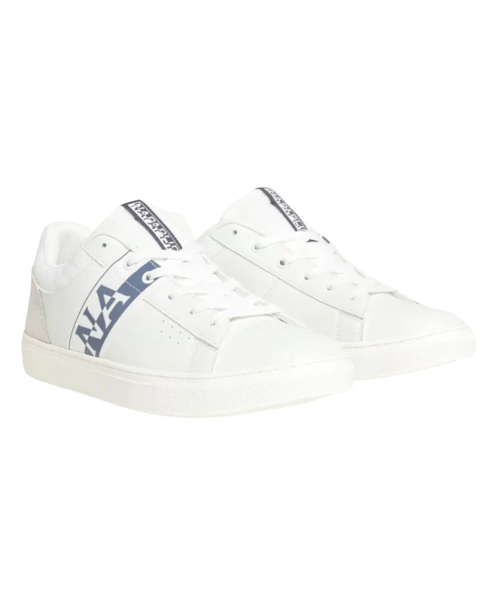 Sneakers bianche modello Birch da uomo by Napapijri, tomaia realizzata in similpelle sintetica, suola in gomma, dettaglio sul retro in pelle scamosciata.