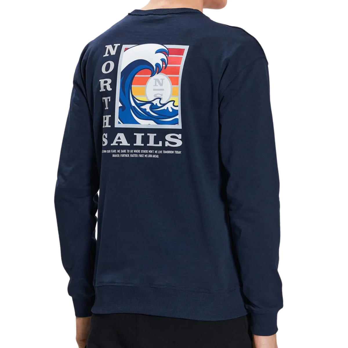 Felpa girocollo in pile organico fiammato con grafica su schiena e petto.