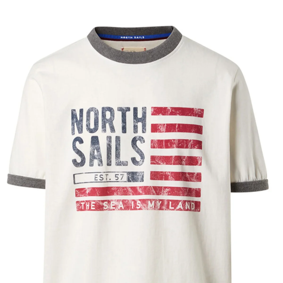 Tee shirt in jersey di cotone pesante con collo e fondo manica in costina a contrasto colore , trattamento vintage. Grafica bandiera Americana stampata con vintage effect.