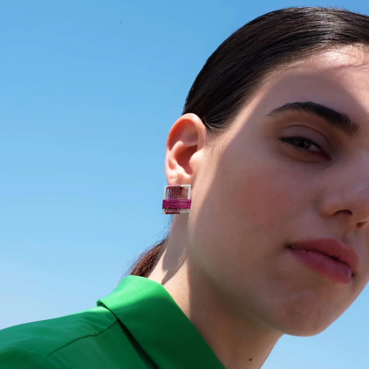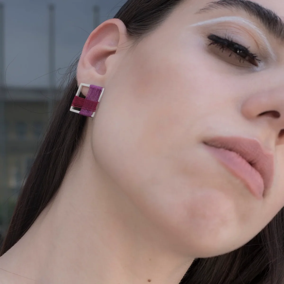 Un paio di orecchini quadrati greci leggerissimi in argento sagomato con intreccio in filo di seta. Gli eleganti orecchini particolari fatti a mano Square sono risultato di un design minimal molto particolare, contrapponendo due materiali come l’argento e la seta. Realizzati scrupolosamente a mano, sono disponibili nelle varianti argento o argento placcato oro e nelle tonalità arancione/marrone, oro/verde smeraldo, rosa/lime, prugna/viola.