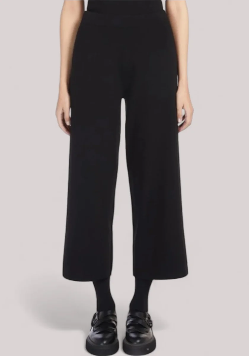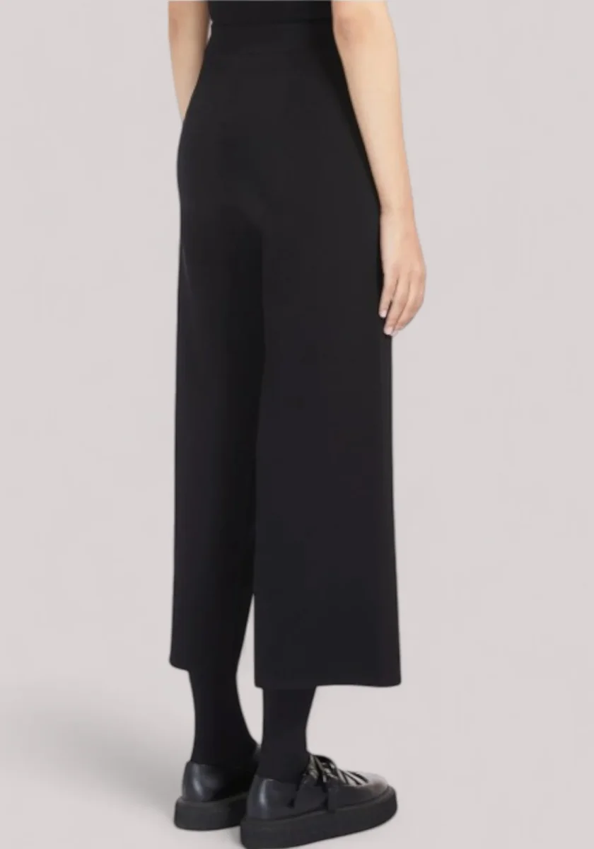 Pantalone cropped alla caviglia, realizzato in filato di viscosa crêpe dalla texture morbida e confortevole. Modello dalla linea essenziale, caratterizzato da una silhouette fluida con gamba ampia e vita elasticizzata.