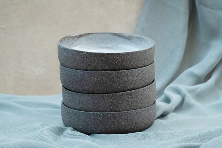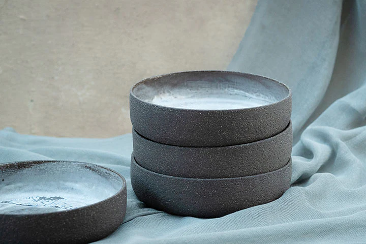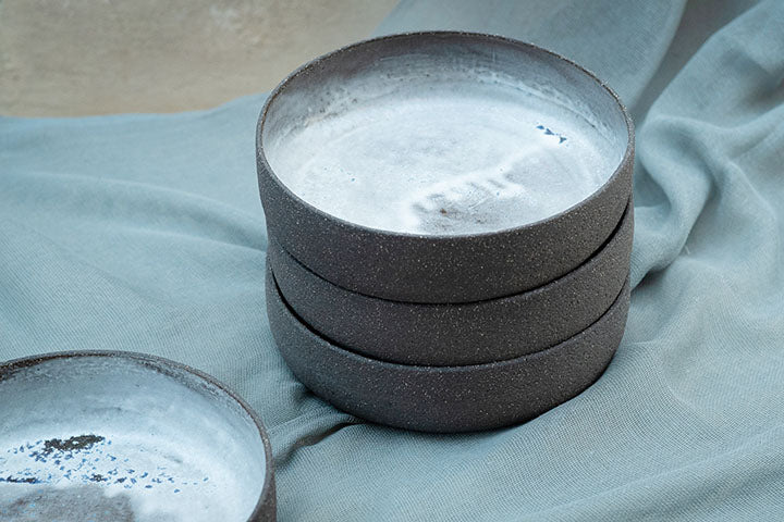 Piatto da pasta piano in ceramica gres nero rivestito con smalto bianco satinato e maculato, cotto a 1220 ℃. Una ciotola per pasta dai bordi alti, il design molto particolare ricorda la superficie di una pietra porosa. Ogni articolo è fatto a mano quindi ci sono piccole differenze nella loro forma, dimensi oni e colore che evidenzia il processo creativo