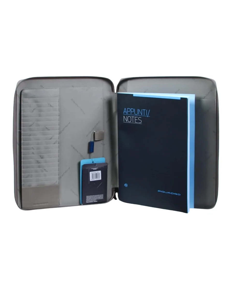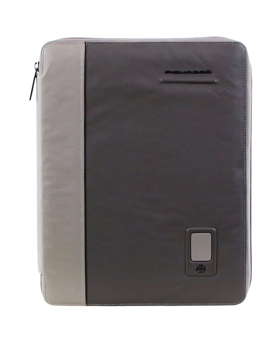 Portablocco in pelle Piquadro, linea Akron, colorazione grigia, costituita da due tonalità differenti a contrasto. Chiusura zip all arouund, scomparti interni porta carte.