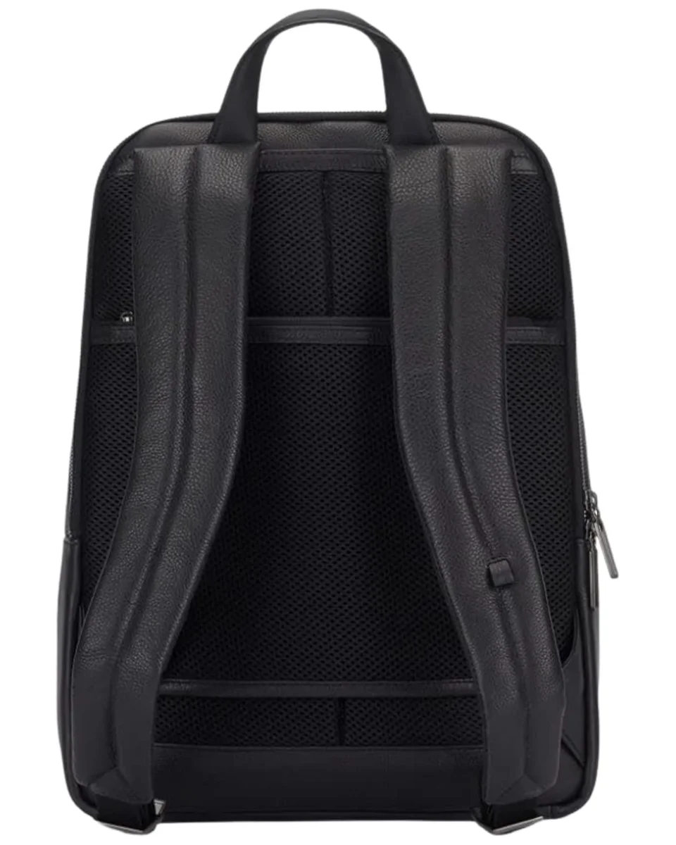 Zaino realizzato in pelle, costituito da due scomparti principali, foderati internamente con tessuto tecnico a base di poliestere: nello scomparto posteriore sono presenti due tasche adiacenti per notebook da 14″ e tablet, con imbottitura anti urto, mentre nel secondo vano sono disponibili numerose tasche per i restanti accessori.
