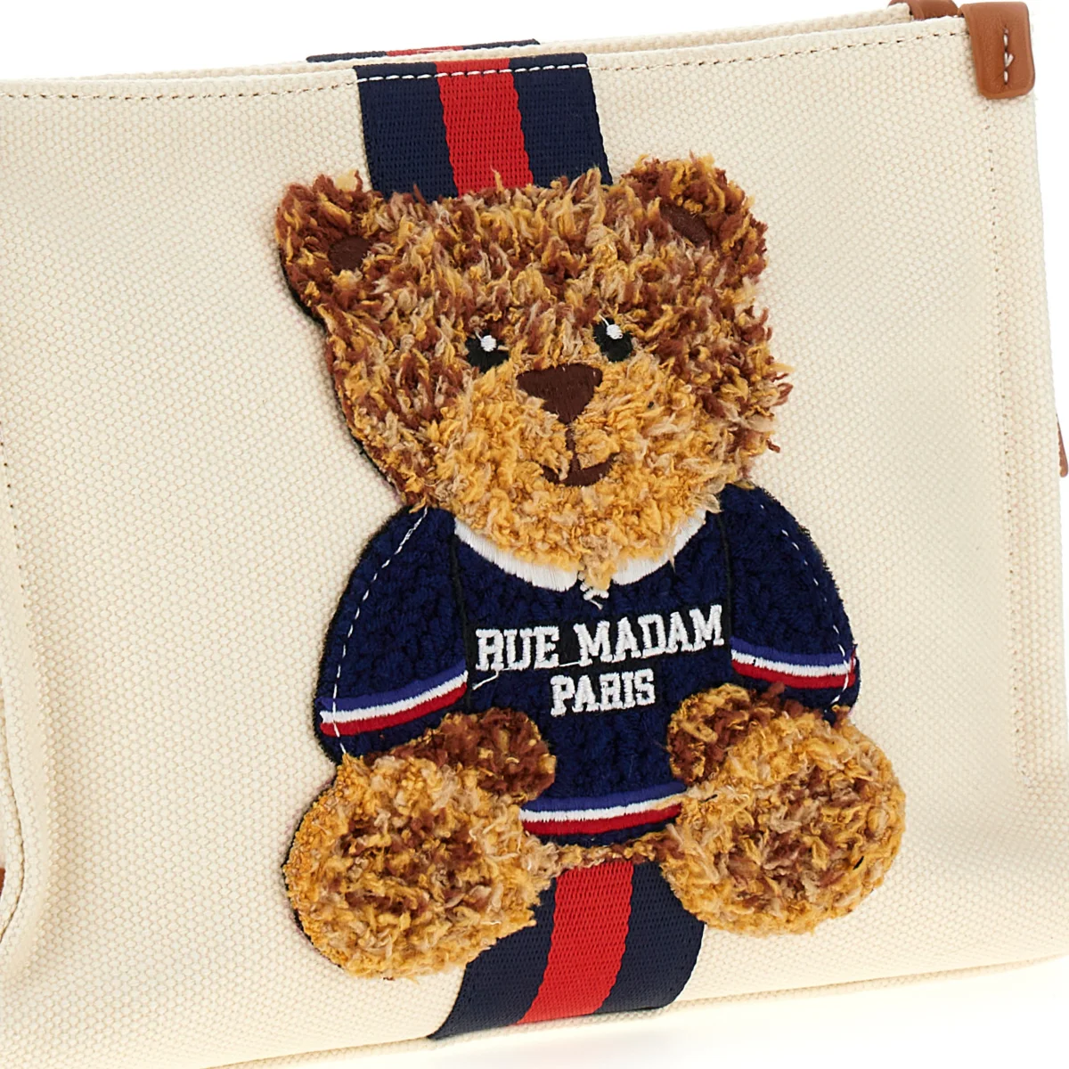 Clutch in canvas con nastro tricolore e orsetto ricamato effetto peluche. Laccio da polso e catenella removibile. Fodera interna in cotone con tasca.