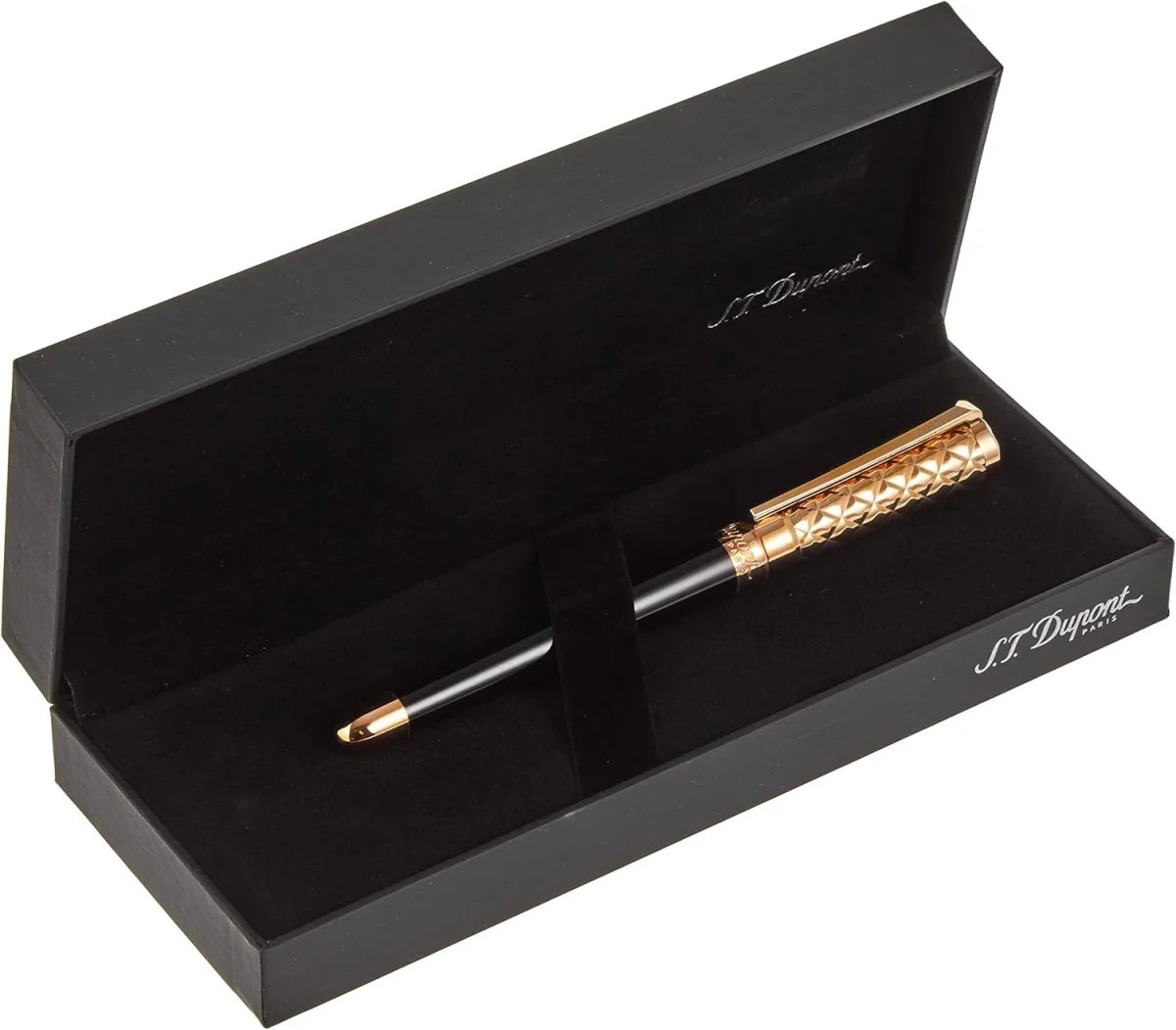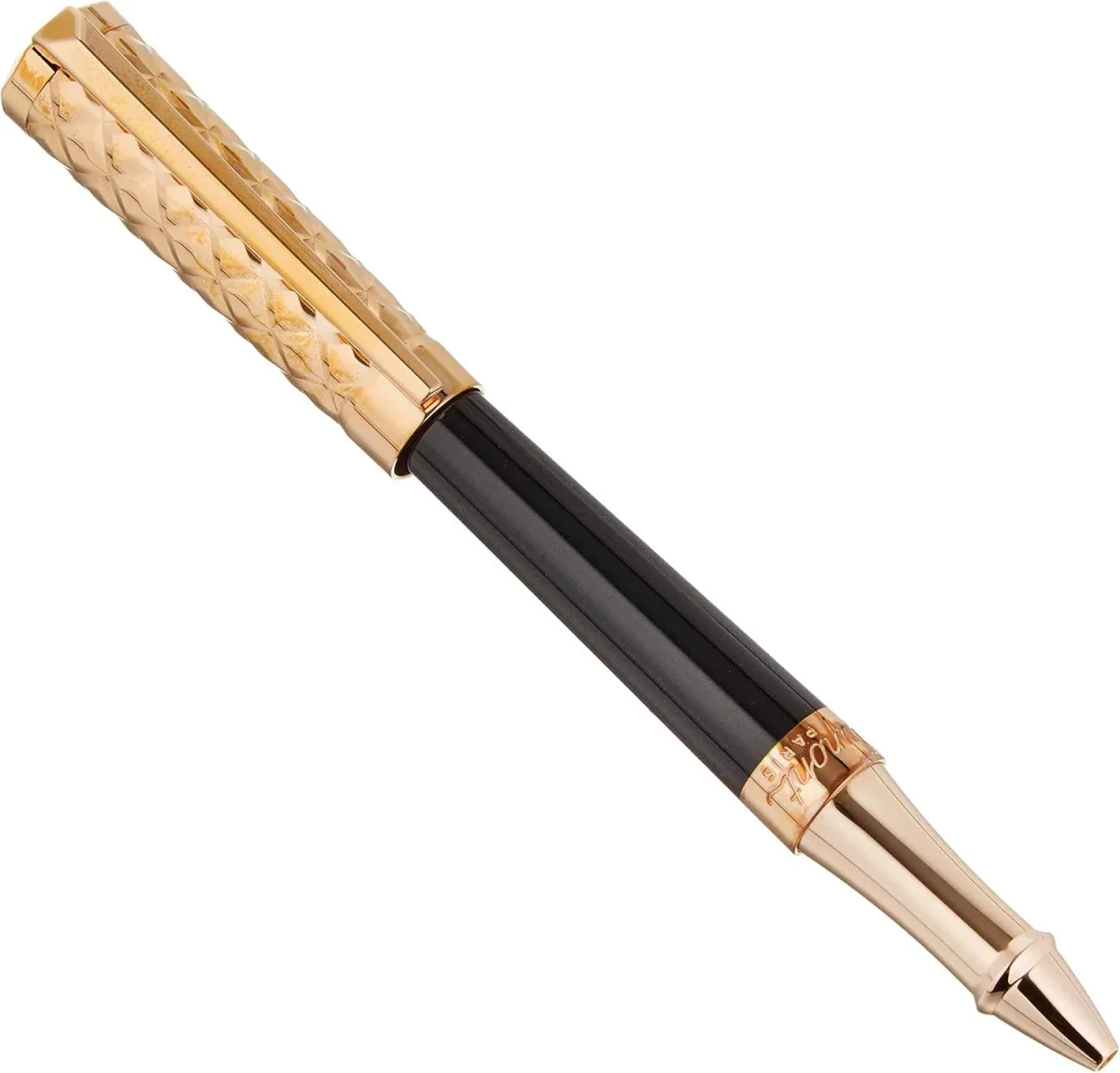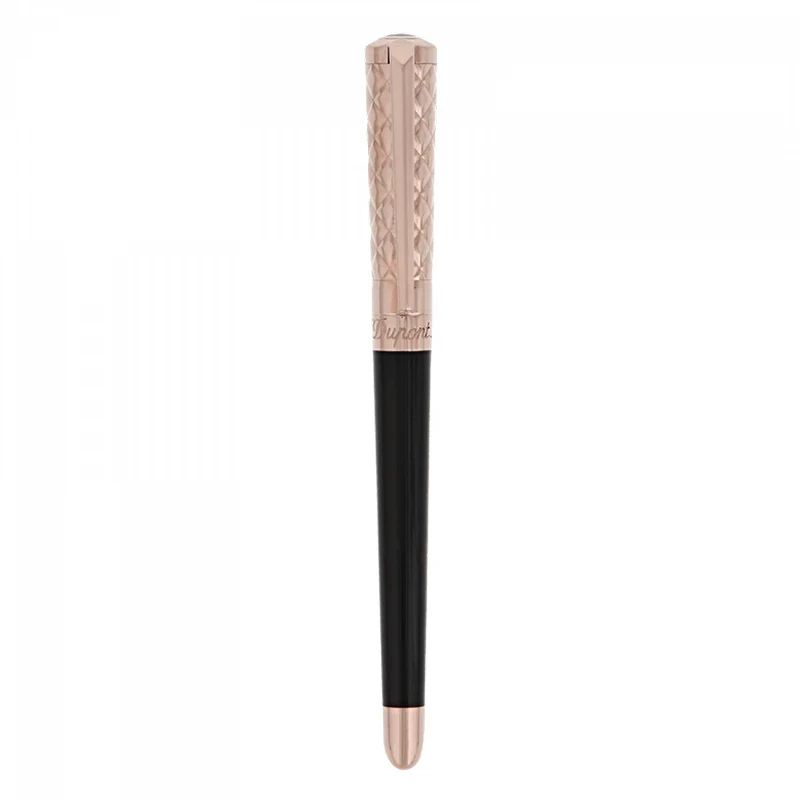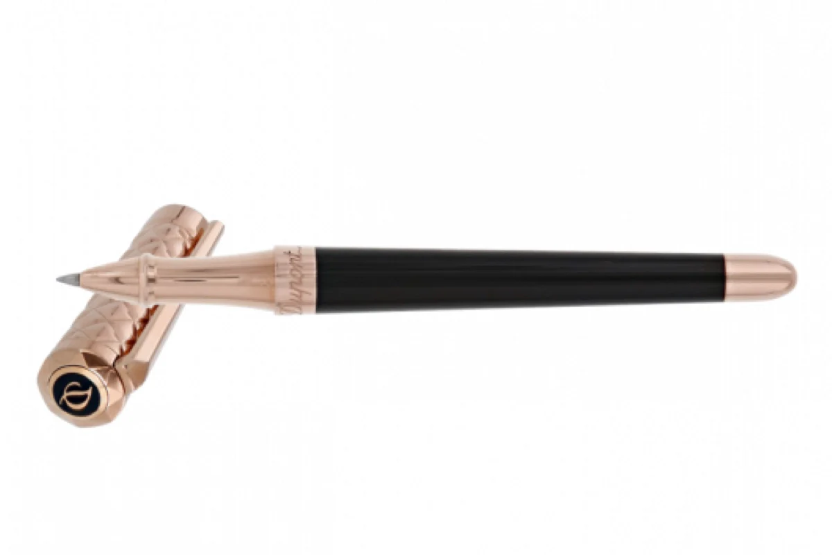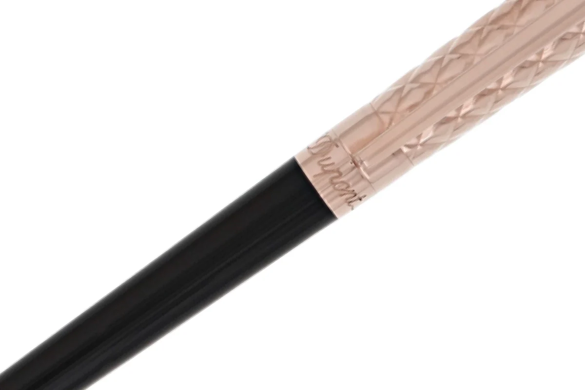 Penna a sfera roller realizzata con lacca nera e finiture in oro rosa, con un bellissimo motivo trapuntato. La parte superiore del cappuccio sfaccettata come una pietra preziosa, come un gioiello. La clip sfaccettata fornisce anche un tocco scintillante.
