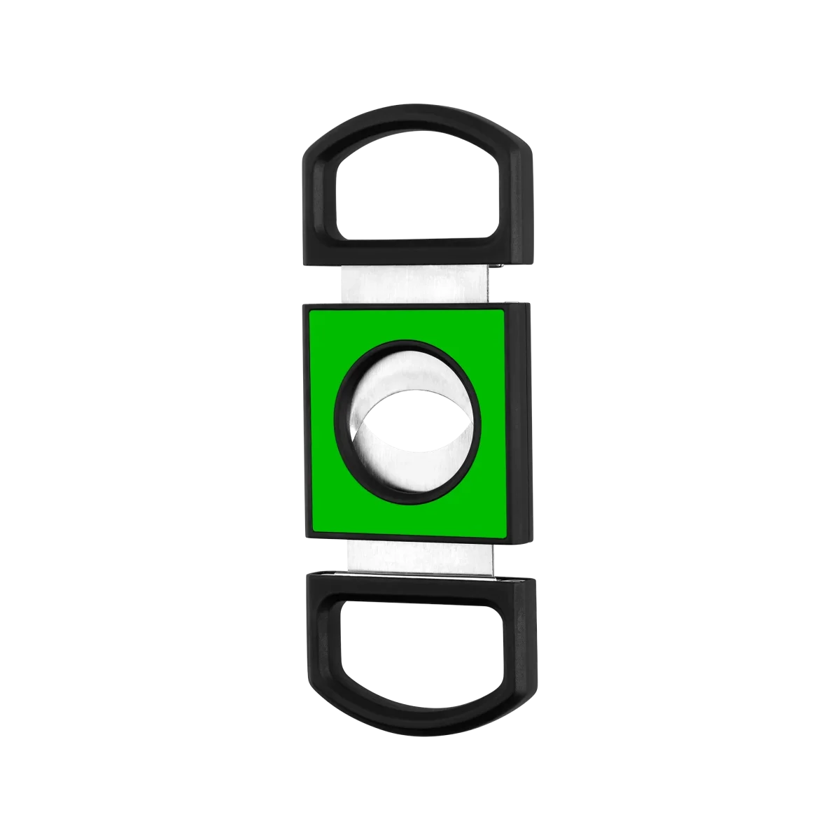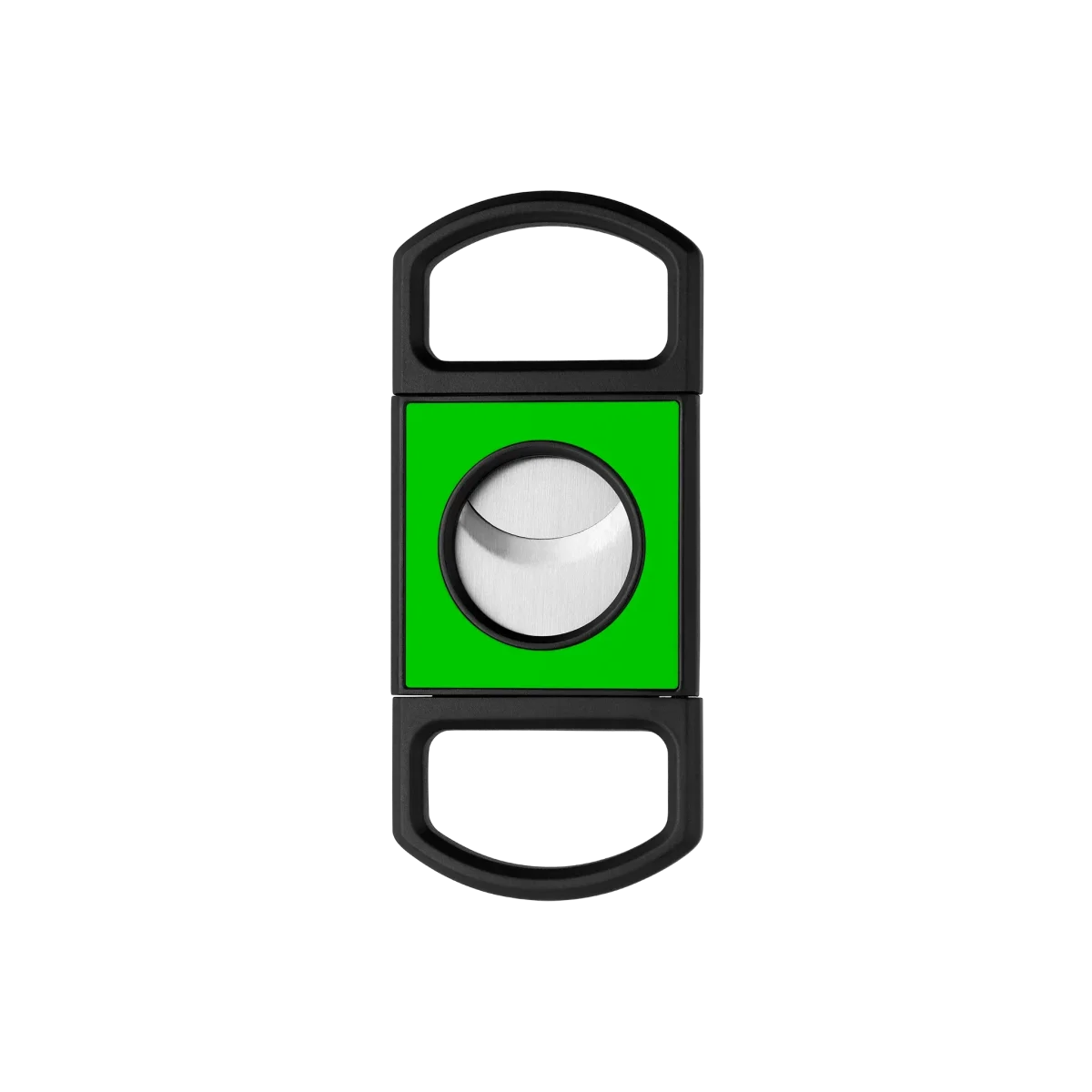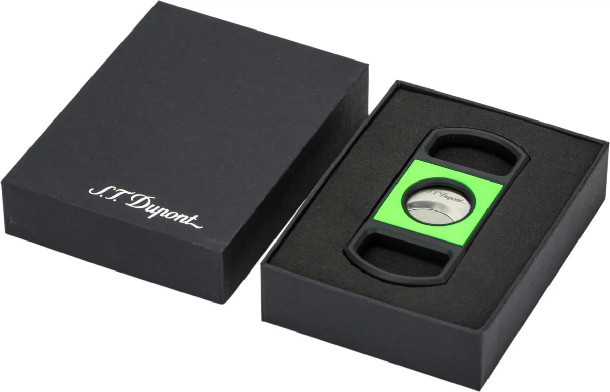 Tagliasigari tradizionale a doppia lama. Finitura nero opaco e lacca lucida verde fluorescente.