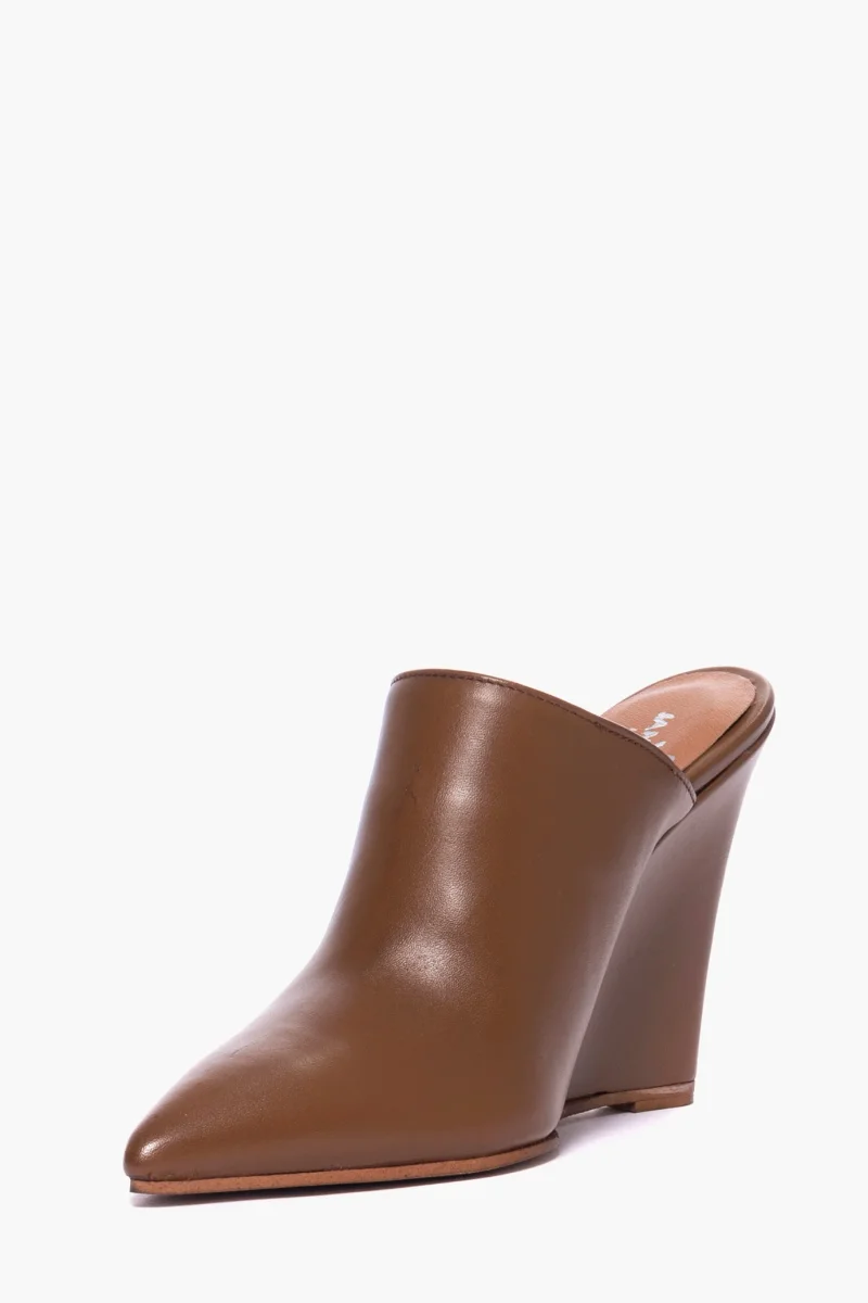 Sabot in pelle cuoio con zeppa rivestita in pelle cuoio, altezza 11 cm, interni e sottopiede in similpelle. Calzata giusta, punta leggermente stretta in avanti. Calzature realizzate in modo artigianale, rigorosamente Made in Italy