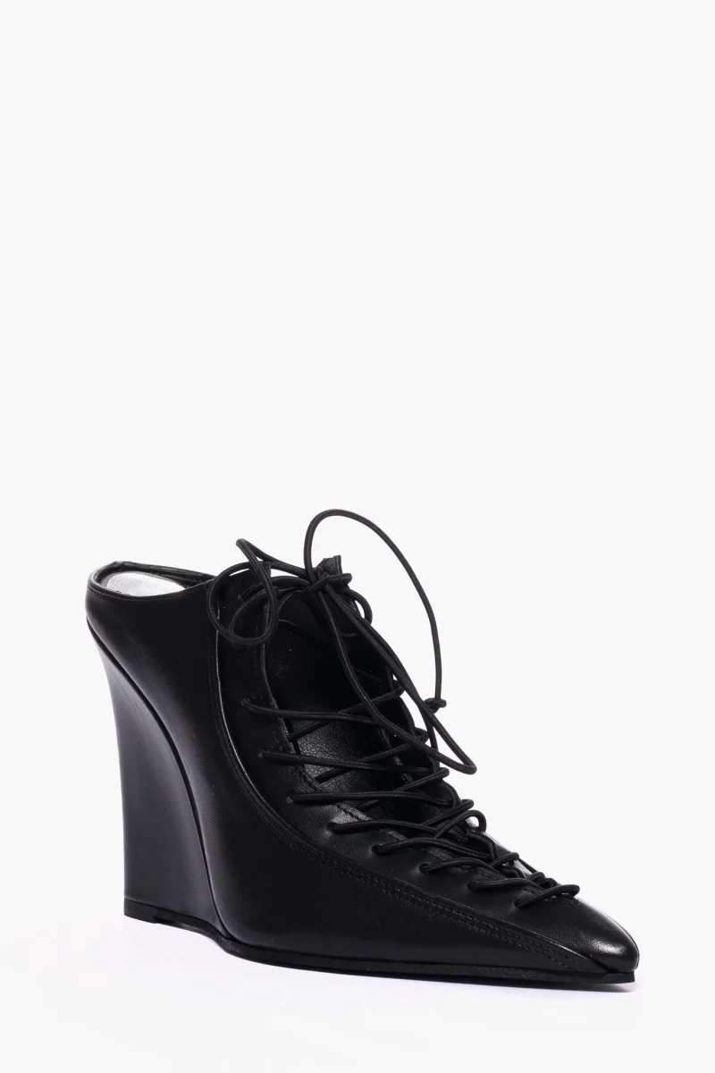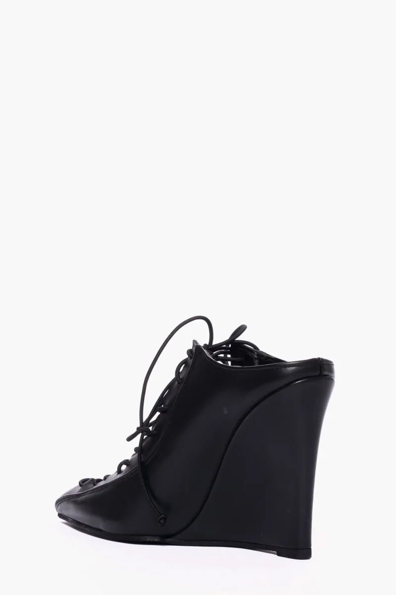 Sabot in pelle nero con lacci e zeppa rivestita in pelle nero, altezza 11 cm, sottopiede in similpelle. Calzata giusta, punta leggermente stretta in avanti. Calzature realizzate in modo artigianale, rigorosamente Made in Italy